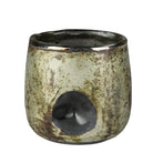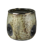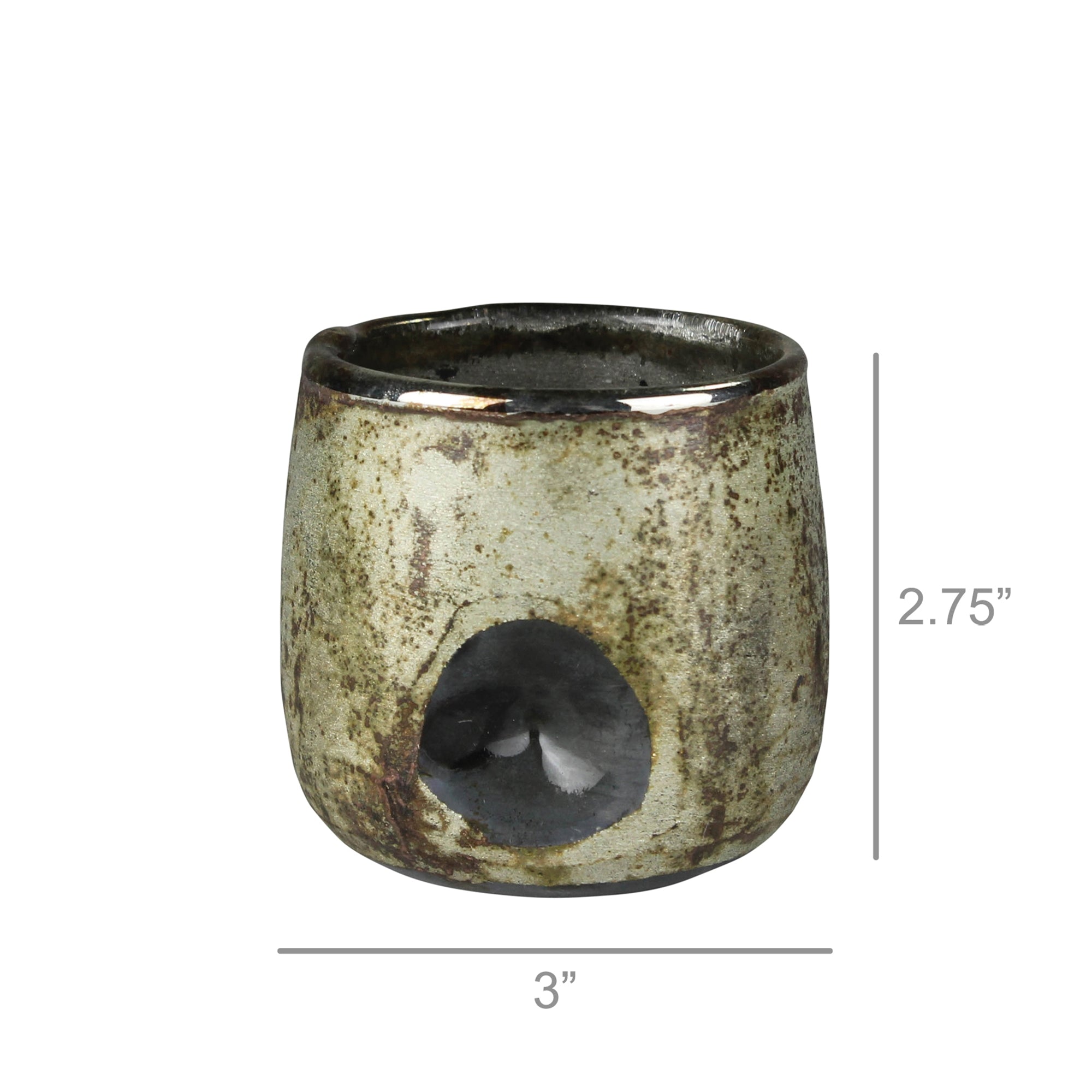 A thick blown glass votive with three indents is given an antiqued silver finish creating a candleholder that emits a warm candlelit glow.
