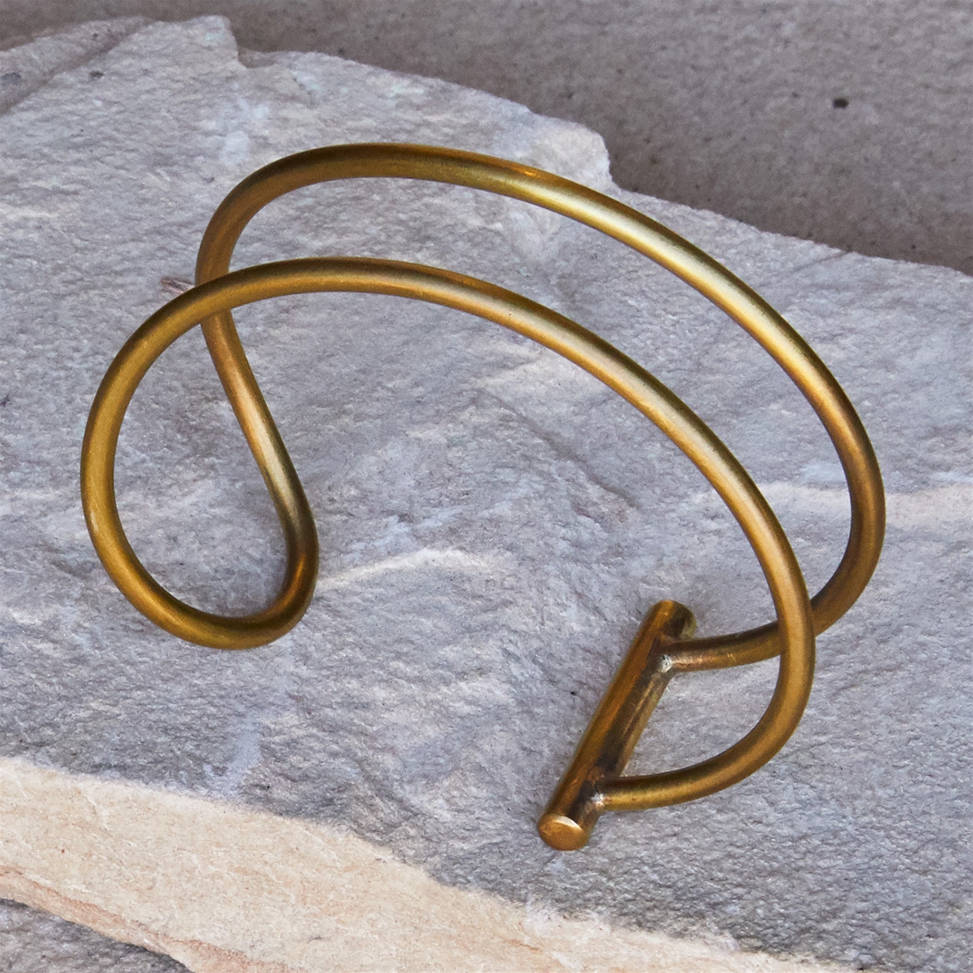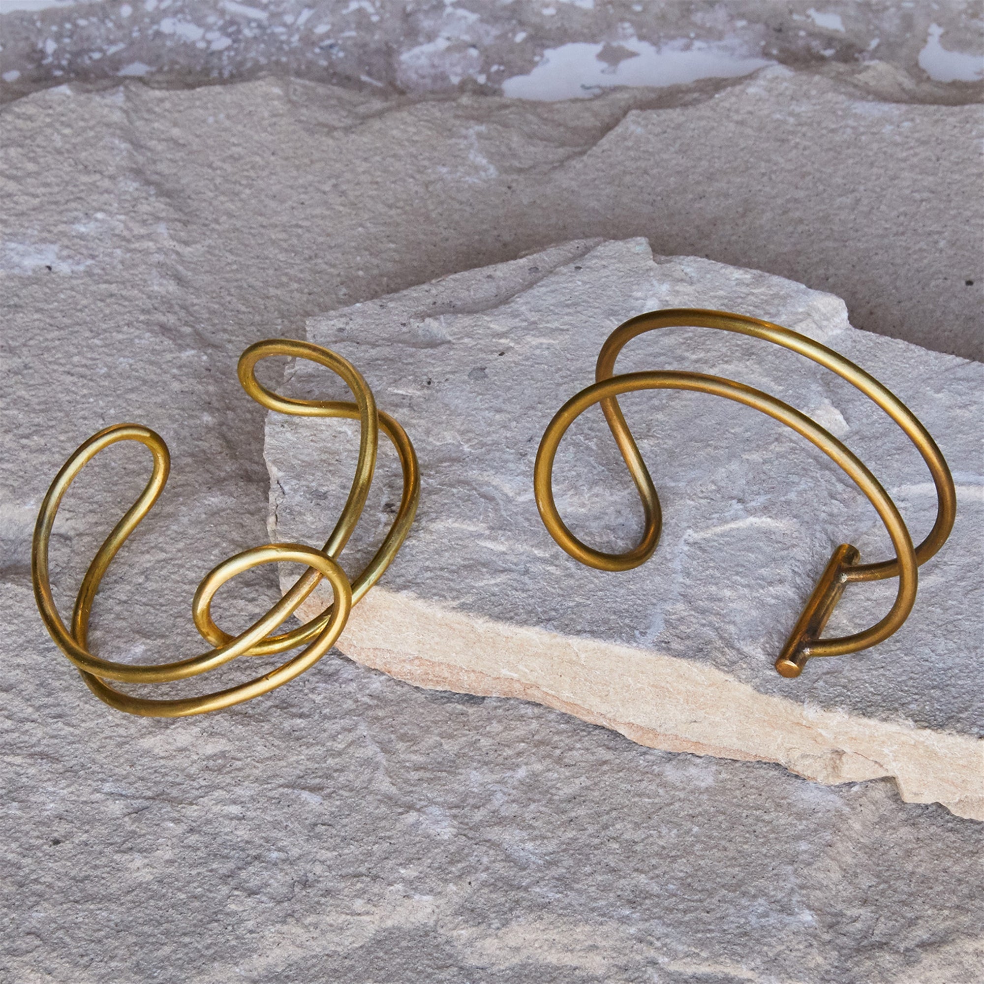 Thick, brass wire is bent and looped to create these classy, comfortable and adjustable cuffs. 2.5"x1"x2"