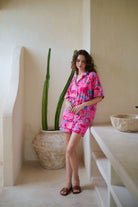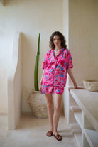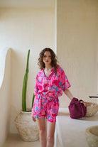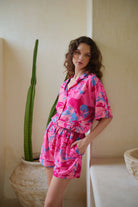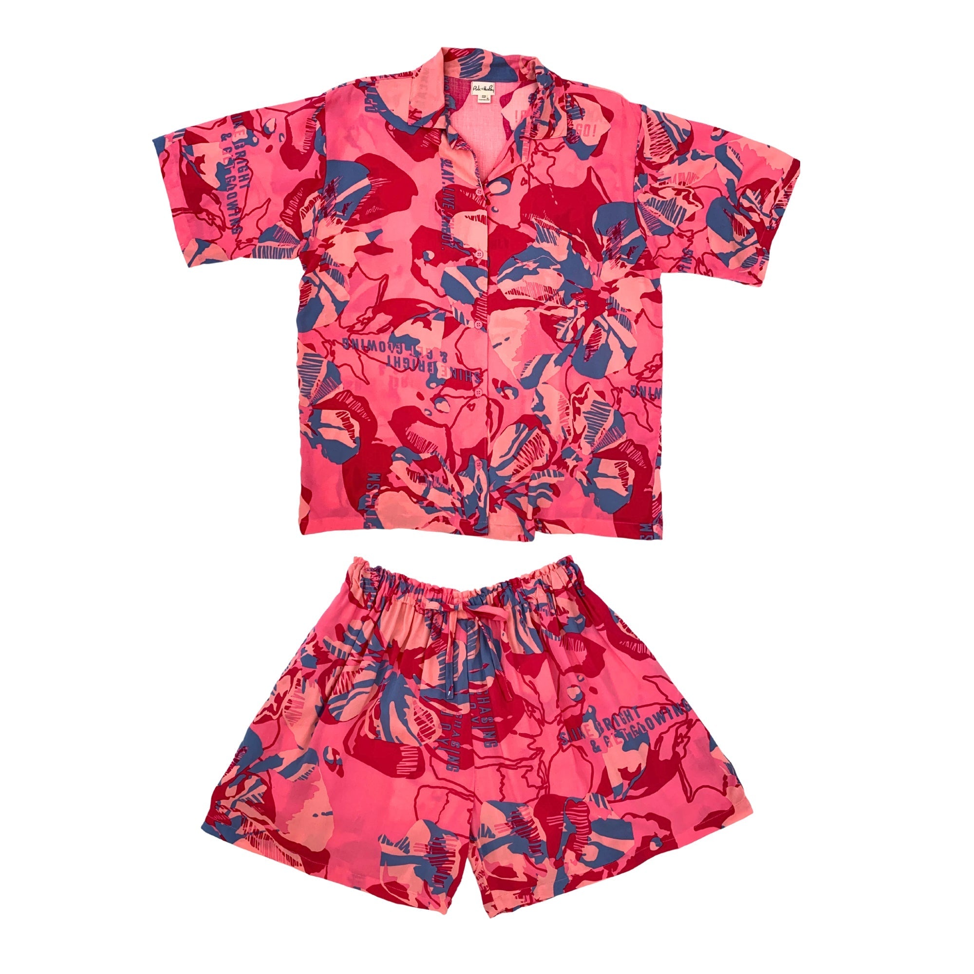 Get ready to take on your travel vacation and rest days in this cozy and lightweight two-piece set featuring a play, live, shine, bright print button down collar shirt and comfy pull-on design with stretchy elastic waist band short.