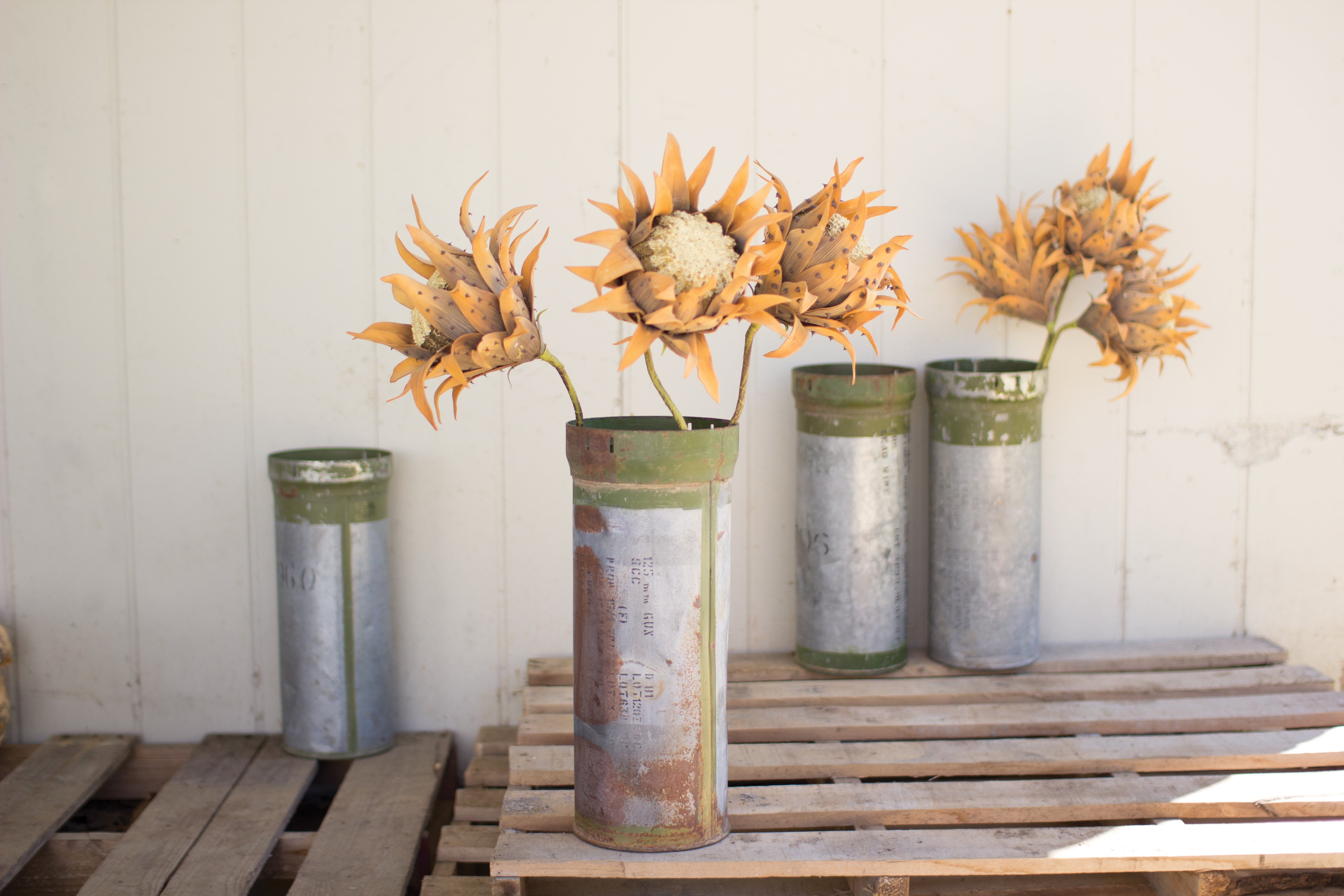 These refurbished ammunition canisters find a new purpose as unique vessels. Each piece is refurbished and may be used as a variety of containers, including umbrella stands or vases. Each canister will vary in color and finish and are not guaranteed to be water tight.