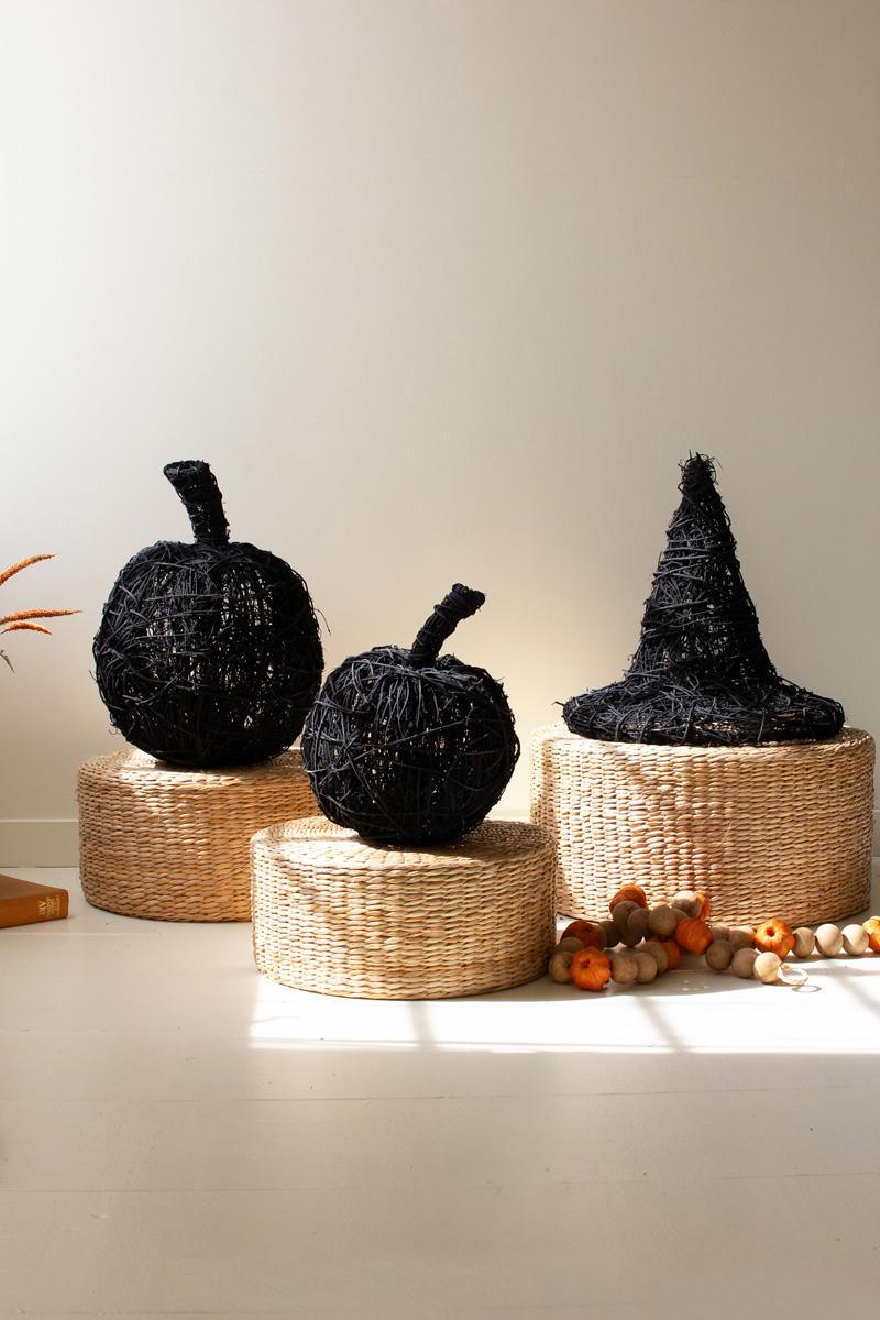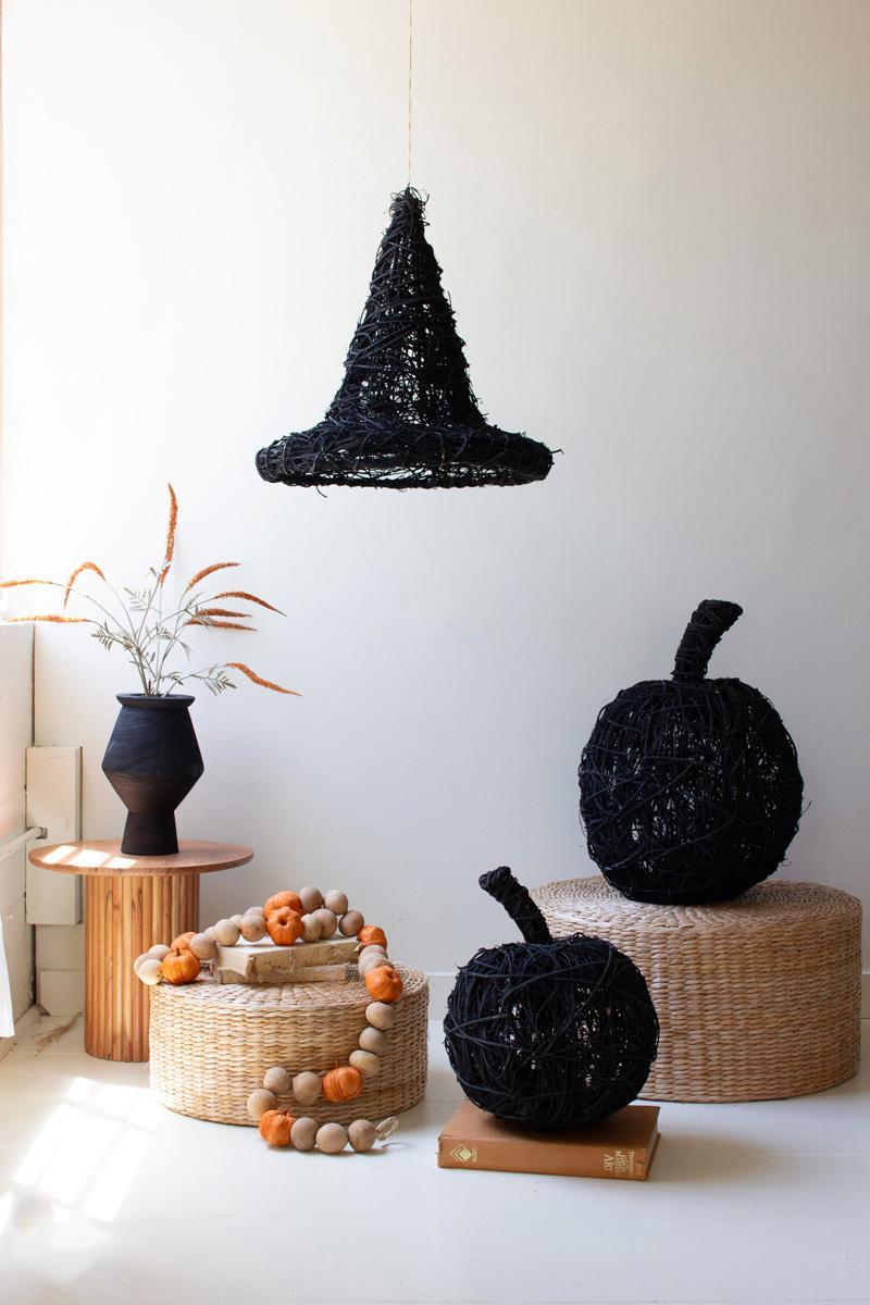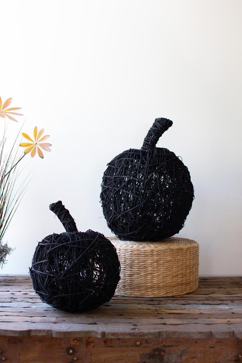 Spice up your spooky with this set of two painted twig pumpkins in black. These Haitian-made gourds add natural charm to your autumn doorway or porch. Scare up a pair for your fall festivities.