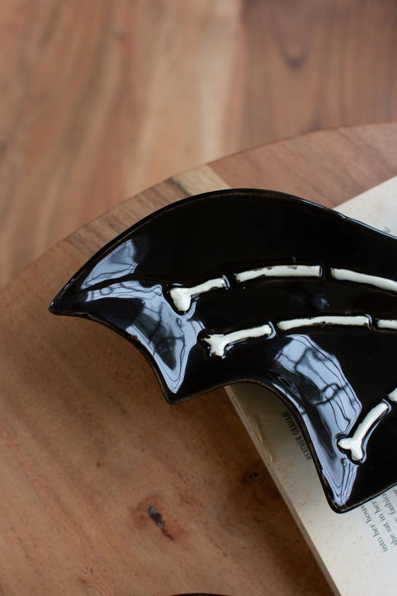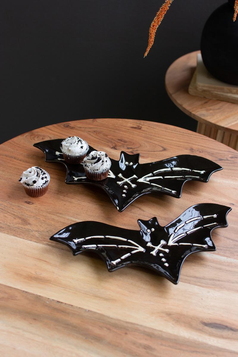 Twin bat plats with skeleton inserts serve as nesting ceramic serving dishes. This set is perfect for Halloween parties and year-round witchy decor. Scare up some new treats for these bat plates.