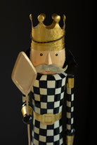 Two kings make this a set. These painted metal and wood checkerboard nutcrackers are made in India. They soar above other decor with their long legs or stand out by the fireplace. Finished front and back. Stake is removeable.