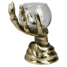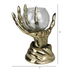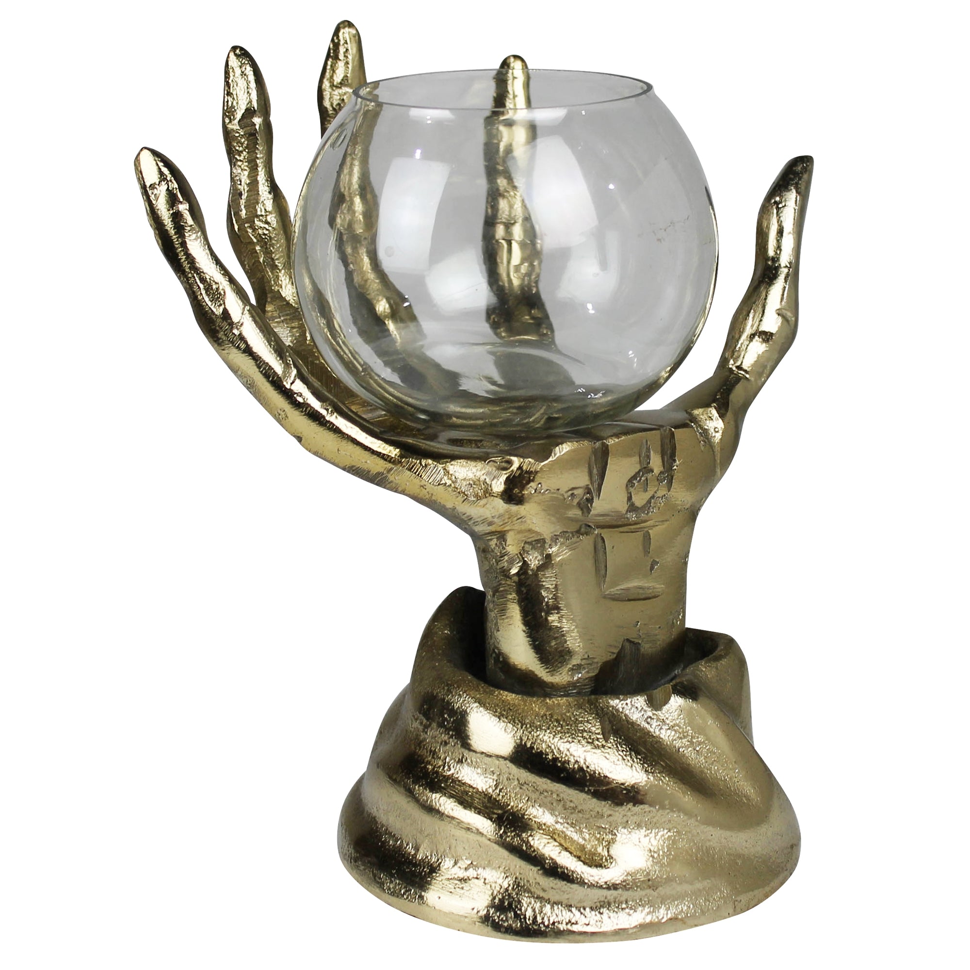 This frightfully fun piece is truly attention grabbing. Crafted of cast aluminum in brass finish, one skeletal hand holds a bowl ready to be filled with floral or candlelight to keep the mood oh-so spooky.