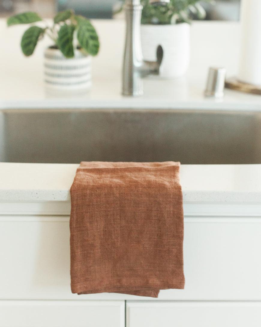 Luxuriously soft from hand-woven from natural fibers, our linen tea towels feature hemmed edges for a clean look and a corner loop for convenient hanging. Each of these kitchen towels are ethically crafted by hand in India from the finest European flax and take hours to make using traditional hand looms and AZO free dyes. Sold individually.