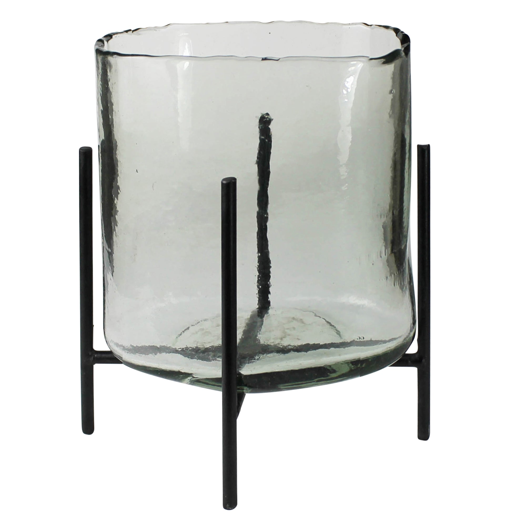 In unexpected oval shapes this recycled glass hurricane aloft in an iron stand flaunts versatility in holding a candle, bedecked with a floral arrangement or chilling a bottle of champagne.