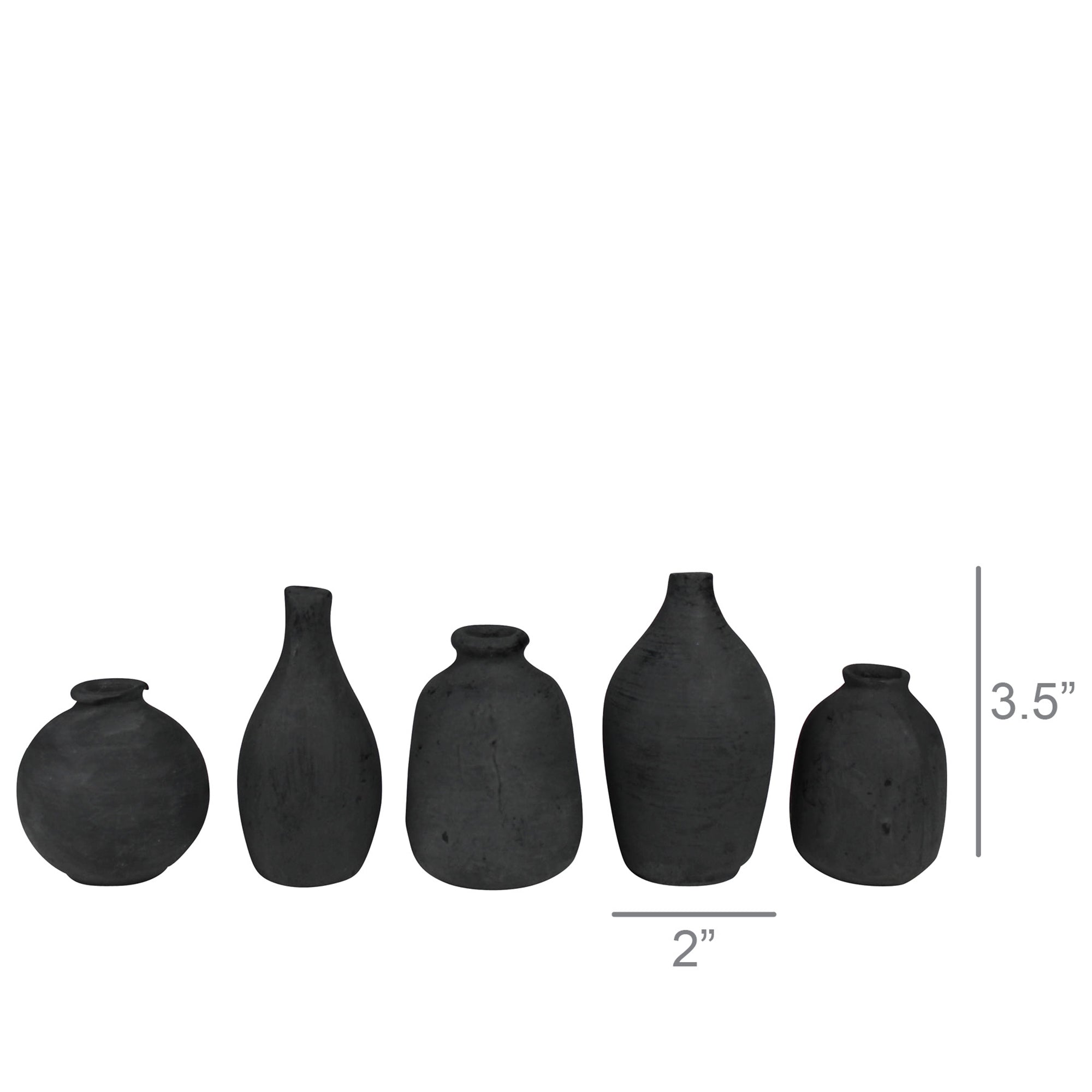 This tiny quartet of terra cotta vessels in matte black clay are distinctive in their own small gathering or further the charm by adding stems of dried floral. Not watertight. Height Range 2.5" - 3.5"