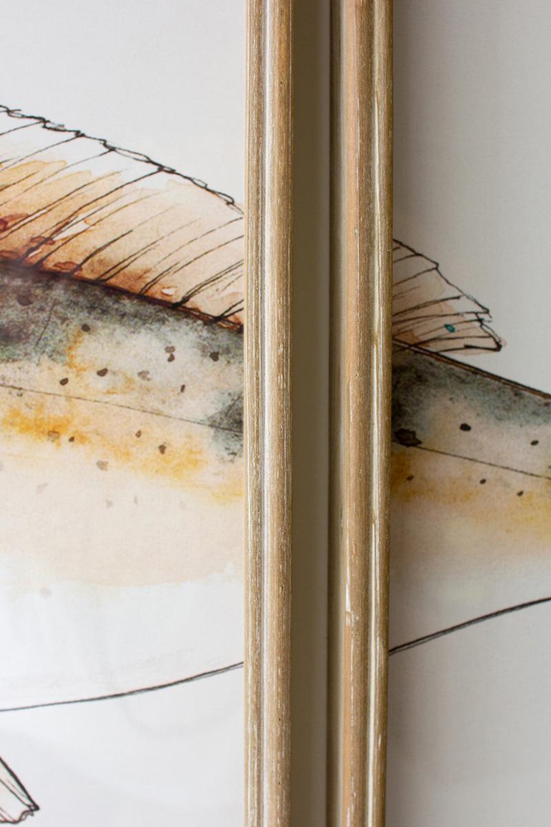 This homage to the oversized catch deserves a place of honor in your lake house or fishing hole. A triple set of prints under glass features a big fish on a white background with antique gold frames. Hang this triptych all together or stagger for a fishy effect.