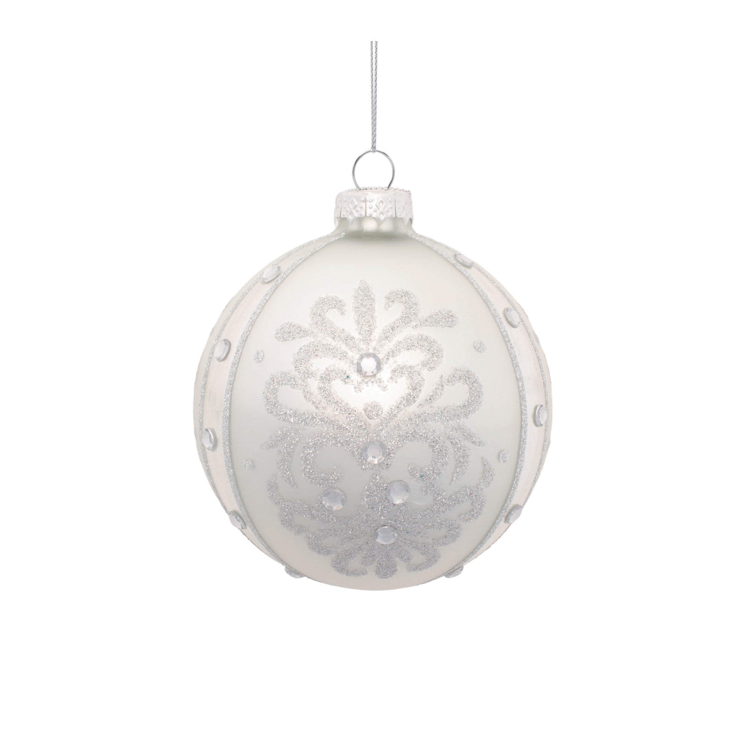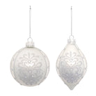 Add a touch of frosted elegance to your holiday décor with this Set of 6 White & Silver Glass Christmas Ornaments. Featuring a mix of 4-inch round and 5-inch teardrop shapes, each ornament is beautifully adorned with silver glitter detailing on a snowy white base. Made from premium glass, these ornaments bring a timeless winter charm to your tree, wreaths, or garlands. Their soft shimmer and classic color palette make them perfect for creating a graceful and festive ambiance.