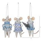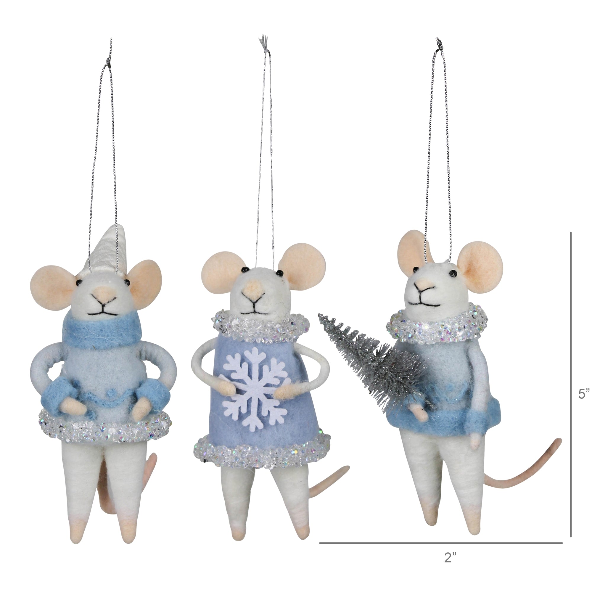 Handcrafted from soft felt, this set of three winter-themed mouse ornaments in cozy blue apparel capture the magic of the season. With delightful details they will add a whimsical, frosty touch to your holiday decor, spreading warmth and cheer. Individual weight 0.6 oz