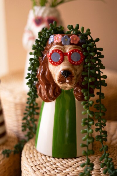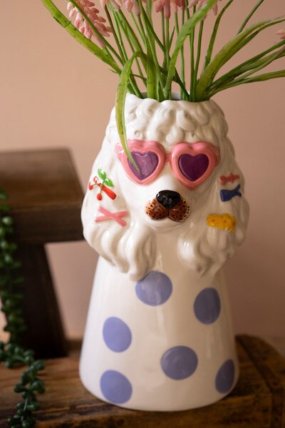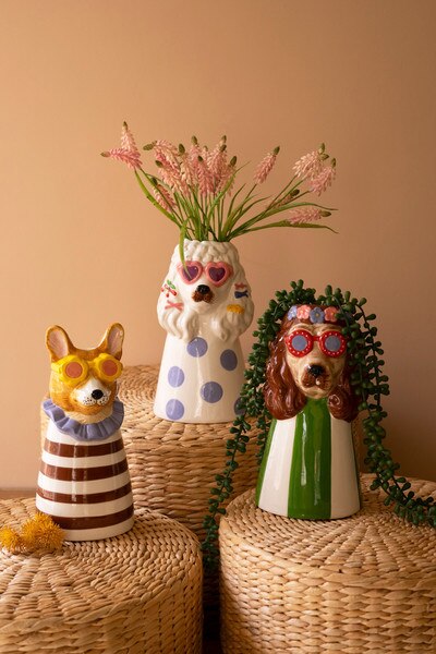 These sun-shaded pups are ready to brighten your day with their cool, laid back style. Each dog brings its own splash of color and personality, making your florals look instantly paw-some. Group them together for a trio that really brings the sunshine, or let them sit in their own favorite spots. Either way, they add a cheerful dose of doggone fun to your decor. Finished on all sides. Rubber feet. No drain hole. Set includes 3 pieces. One each style.