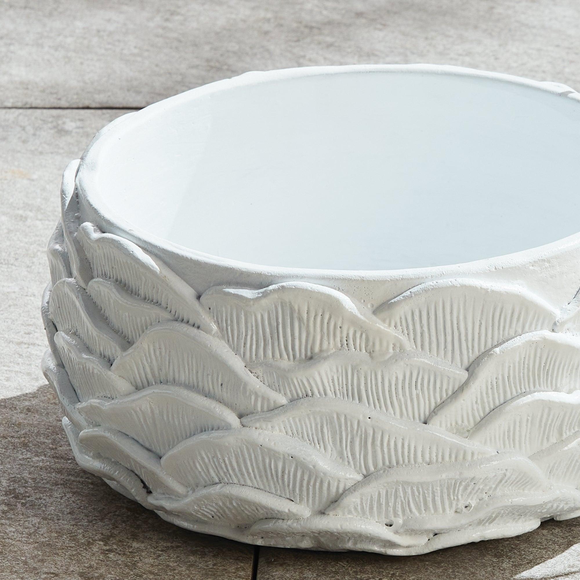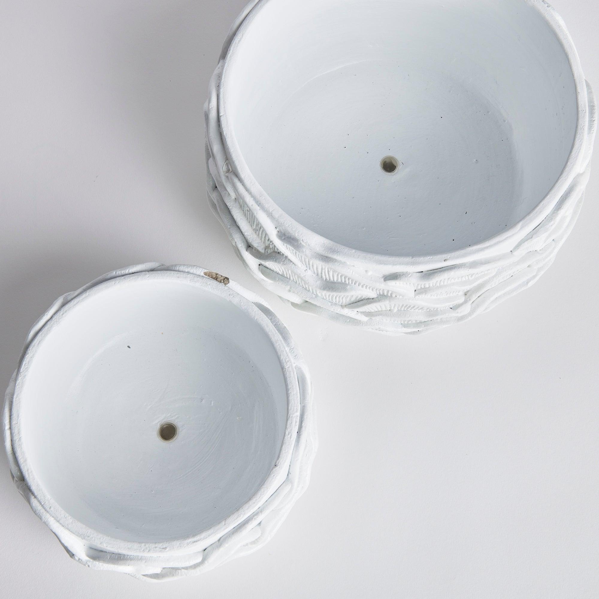 The oversized, layered petals that adorn this set of pots give it an artisan feel. The bright white glaze and hand finished touches make it a great value. Fill it with lush greens or a prized orchid and enjoy!