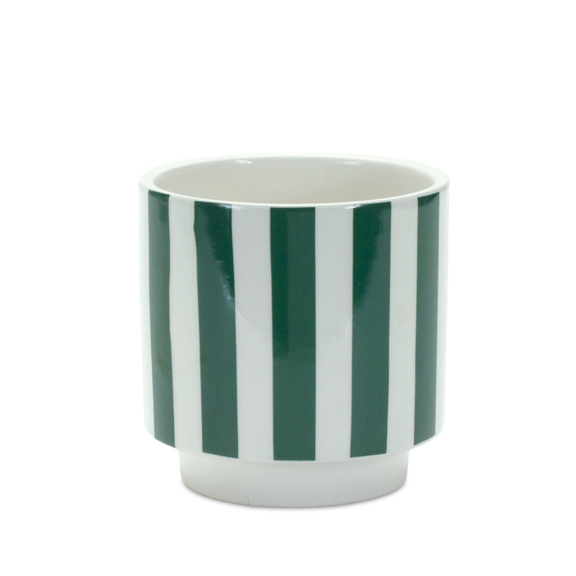 Display your plants in style with this stunning set of Decorative Pots. Featuring two assorted sizes, the deep green and white hues paired with the vertical stripe design makes this set a great addition to your everyday home decor. The quality dolomite composition and glaze finish is sure to last for seasons to come. Complete the look by dropping a faux potted plant or floral arrangement in each pot.