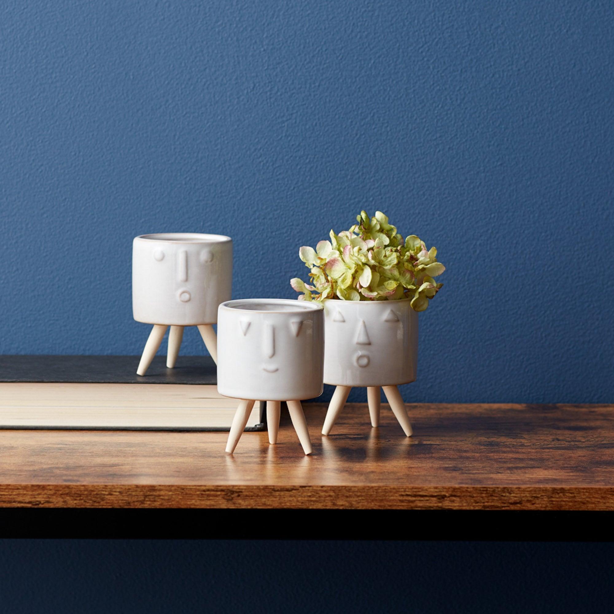 Display your plants in style with this chic set of glazed Decorative Porcelain Face Pots. Featuring three assorted designs, the fun smiley-face design paired with the natural wooden and white hues is the perfect combination to create a stunning display. The quality terracotta and glaze finish is sure to last for seasons to come. Complete the look by dropping in a faux potted plant or succulent.