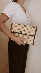 Introducing our Eva Leather and Cane Clutch, a sleek and sophisticated accessory. Crafted with genuine leather and delicate cane detailing, this clutch exudes elegance. Its minimalist envelope design adds a touch of modernity. Handcrafted with meticulous attention to detail, it's the perfect complement to elevate your look with effortless style.