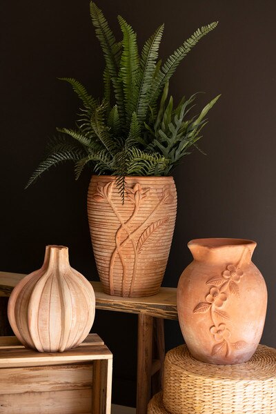 Defined by its rounded silhouette and rhythmic vertical ridges, this terracotta vase brings beautiful texture and earthy warmth to any room. Its soft, sculptural form stands gracefully on its own or as a grounding base for stems and branches. Finished all around.