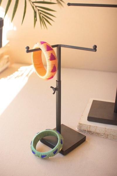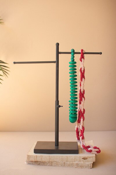 These adjustable metal jewelry displays bring a touch of refined simplicity to your dresser or vanity. Their clean lines and balanced proportions make it easy to drape necklaces or bracelets in a way that feels both organized and beautiful. A practical pair with a sculptural presence. Set includes 2 pieces. One each size/style.