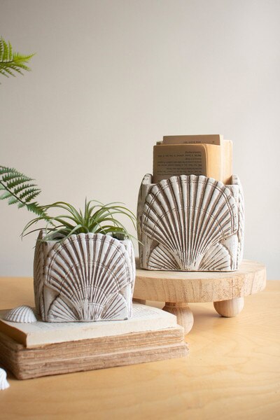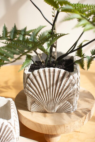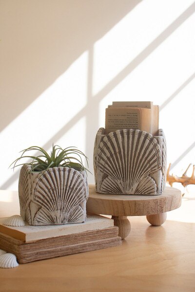 Shaped like coastal treasures, these cement shell planters bring a relaxed seaside charm to your home. Their textured surfaces and soft neutral tones work beautifully with succulents, small ferns, or trailing plants. A lovely pair for windowsills, bathroom counters, or sunlit shelves. Set includes 2 pieces. One each size.