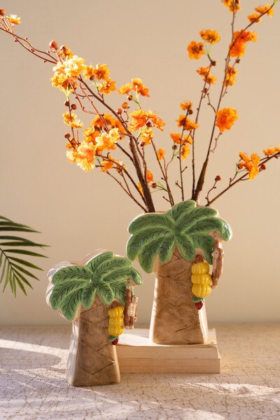 These palm tree vases bring instant vacation vibes. Each one looks like a tiny tropical escape with leaves reaching for the sun. Fill them with florals or let them stand tall as your new miniature beach buddies. Finished on all sides. Free hanging monkey. Set includes 2 pieces. One each size.