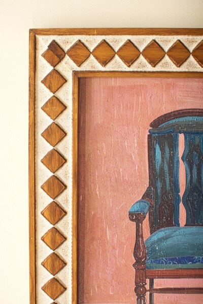 These two chair paintings bring a comforting touch of nostalgia to your walls. Each piece features a bold, colorful chair set against softly textured backgrounds, framed with a warm, geometric border that adds artisanal charm. Displayed together, they feel like quiet moments waiting to be shared... inviting, comforting, and full of character. A simple way to bring warmth and personality to any cozy corner. 2 sawtooth hangers. Frame is embossed. Set includes 2 pieces. One each style.