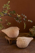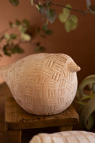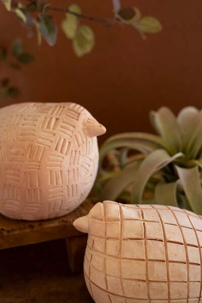 Shaped with gentle curves and a weathered finish, these terracotta birds add a sweet, artful presence wherever they perch. Display them together for a harmonious pair or scatter them for a playful, nature-inspired touch. Finished all around. Embossed/textured design. Solid/closed on the bottom. Set includes 2 pieces. One each size.