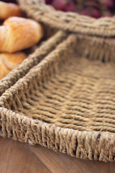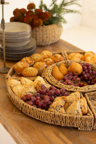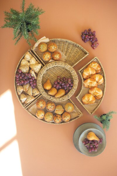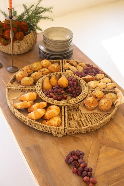 Crafted from woven vine with a rich, earthy tone, this five piece serving set adds natural texture to entertaining. The round base tray holds fits into coordinating pieces, making it easy to serve fruit, pastries, or small bites. Functional and beautiful, it brings an effortless, rustic touch to gatherings. Set includes 5 pieces. One round basket and four quartered baskets.