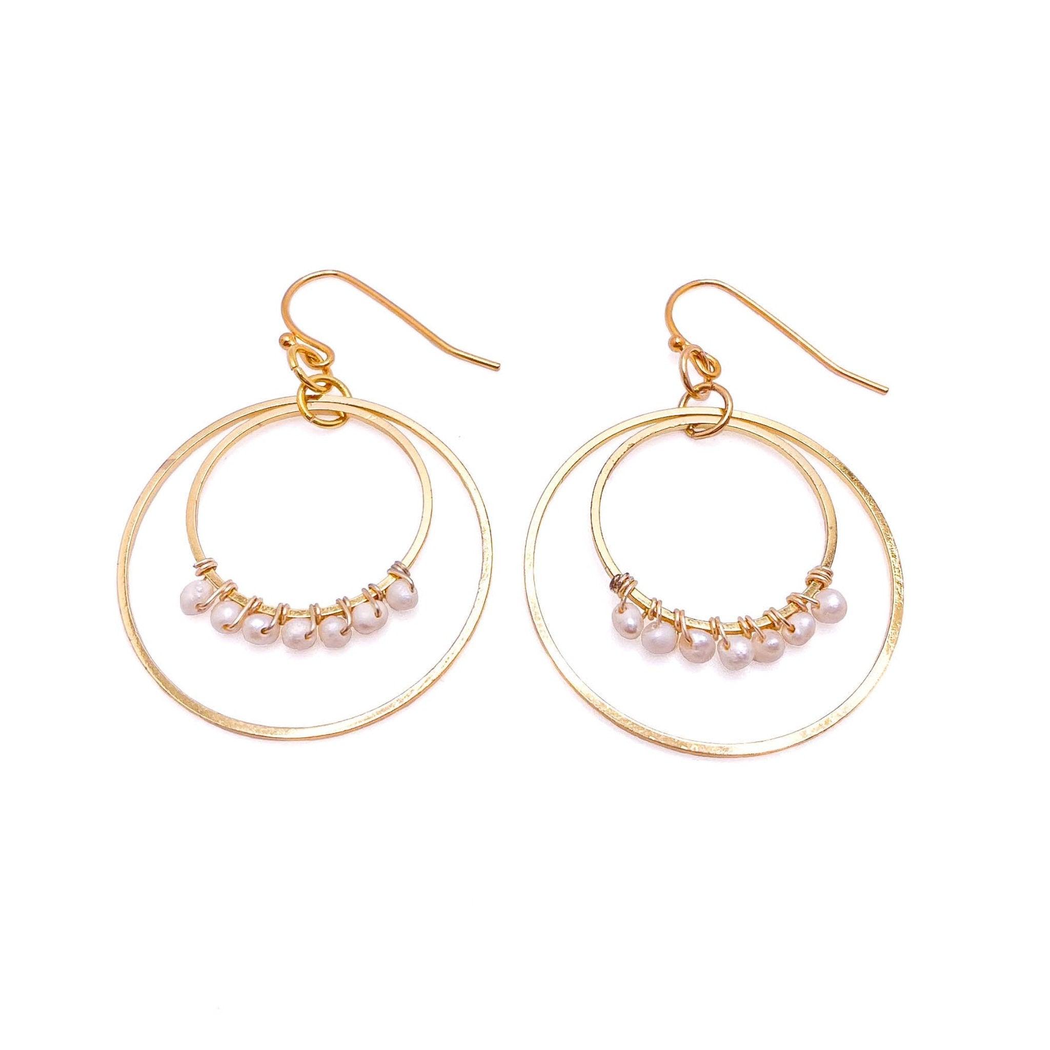 Show your sophistication in style with these Cornerstone Earrings. Two concentric circles of gold form the lightweight structure of the earrings, with tiny freshwater seed pearls wired onto the bottom of the inside loop, creating a timeless, classy statement. Shine your brightest with these hypoallergenic and luxurious earrings.