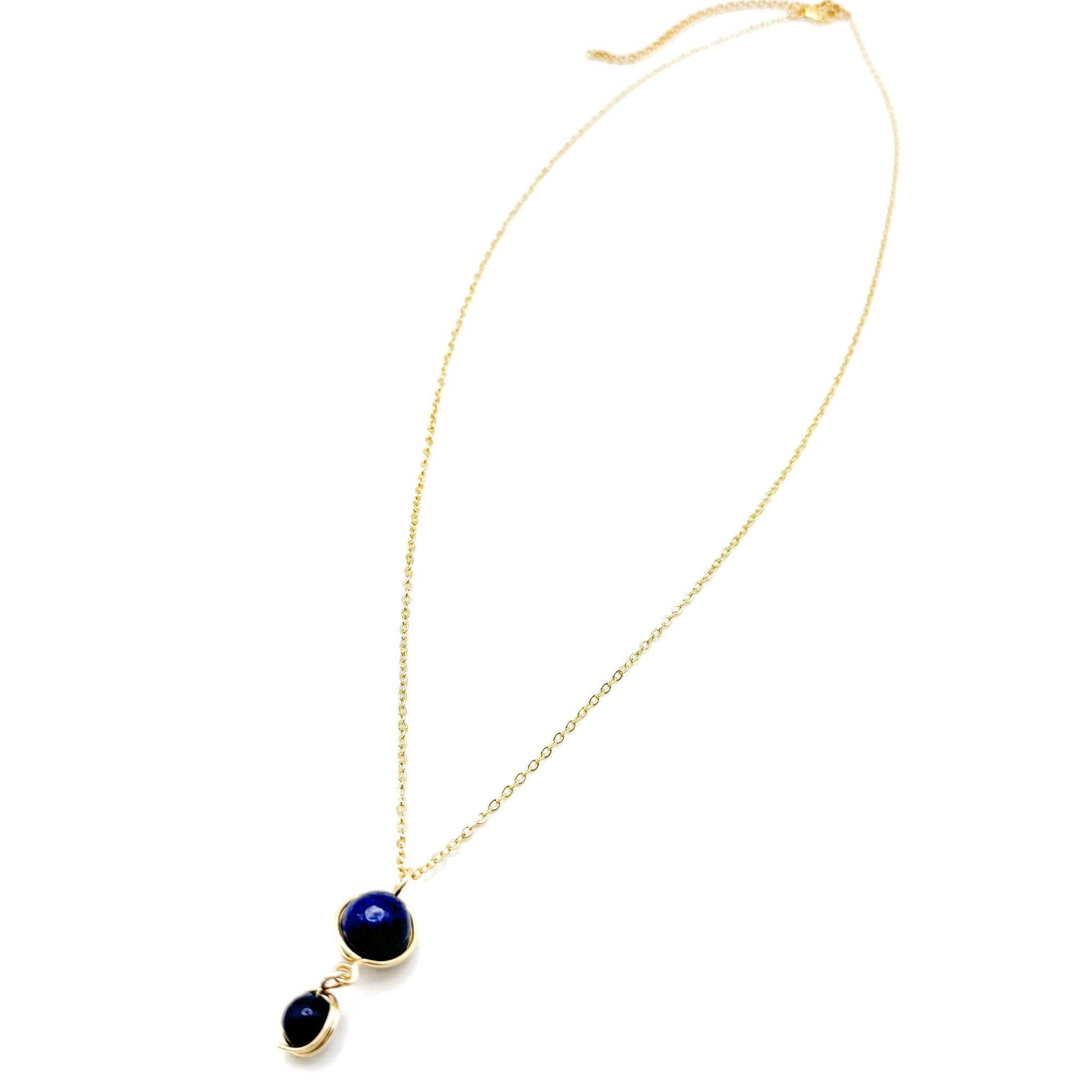 Two Lapis Lazuli stones, one 8mm and one 6mm are enveloped in gold plated wire and looped together in a perfect simple pendant. A 21 inch gold plated cable chain with a 3 inch extender and lobster clasp will let this deep blue necklace accessorize almost any neckline in your spring wardrobe.