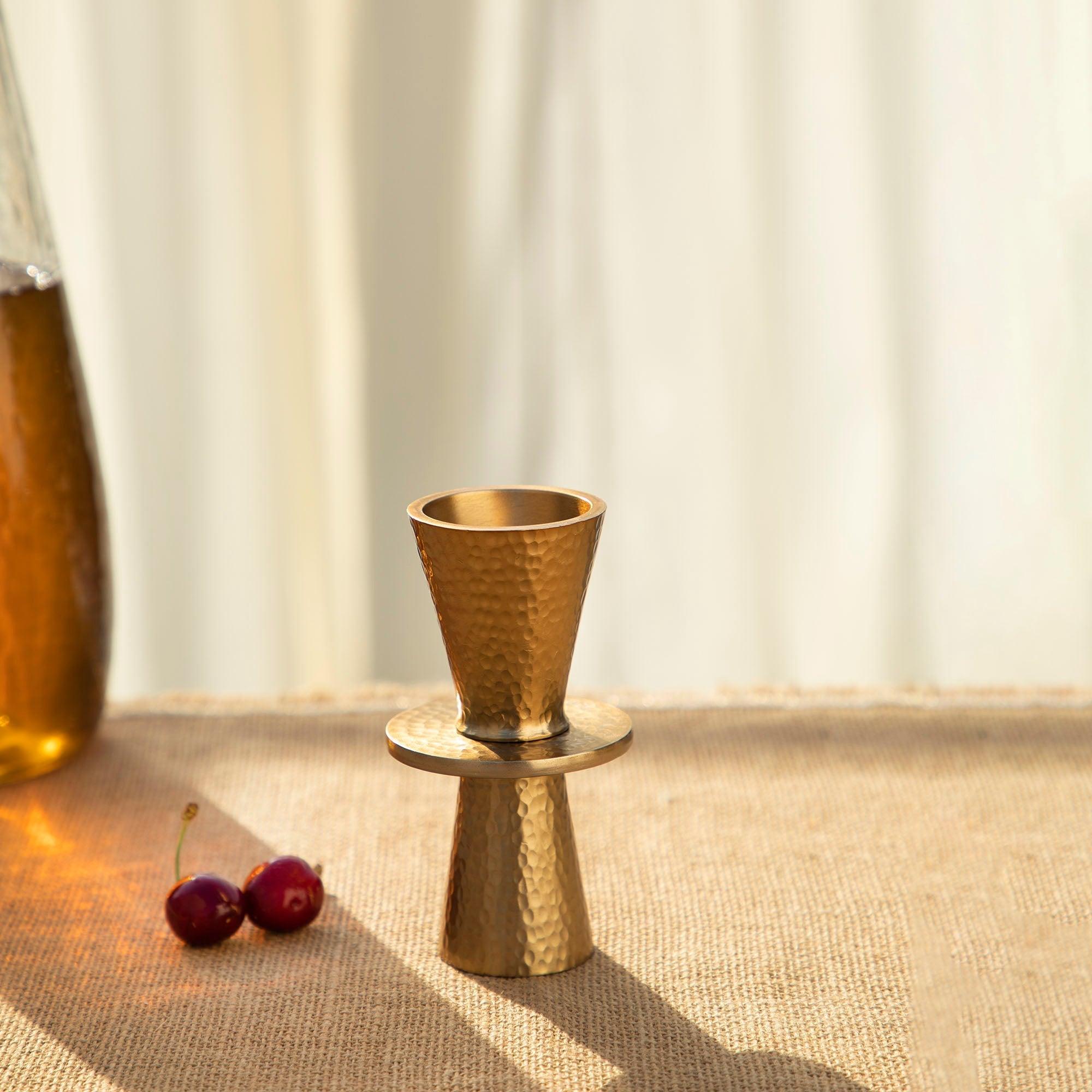 This indispensable bar tool measures 15ml shots on one end, and 30ml shots on the other, ensuring a perfect pour every time. Handcrafted from brass-finished aluminum embellished with a gently hammered texture, this calibrated double jigger is a perfect complement to our cocktail shaker, decanter, and long spoons, and an essential component of any home bar.