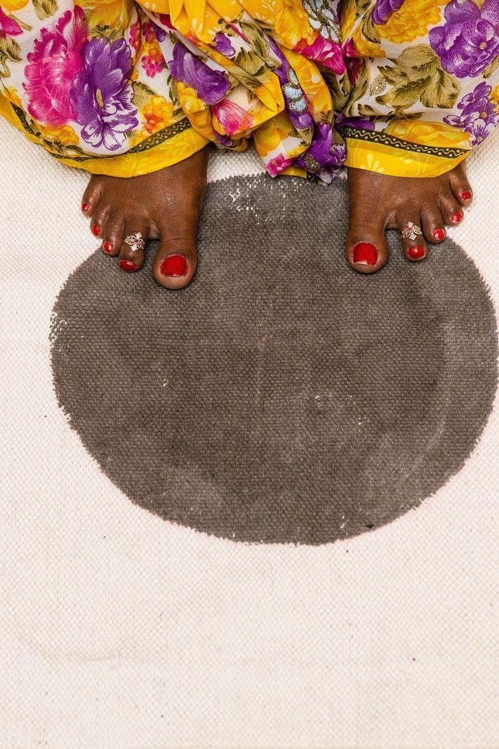The design is hand-pressed onto each rug using hand-carved wooden blocks dipped in dyes. All rugs are made in small batches.