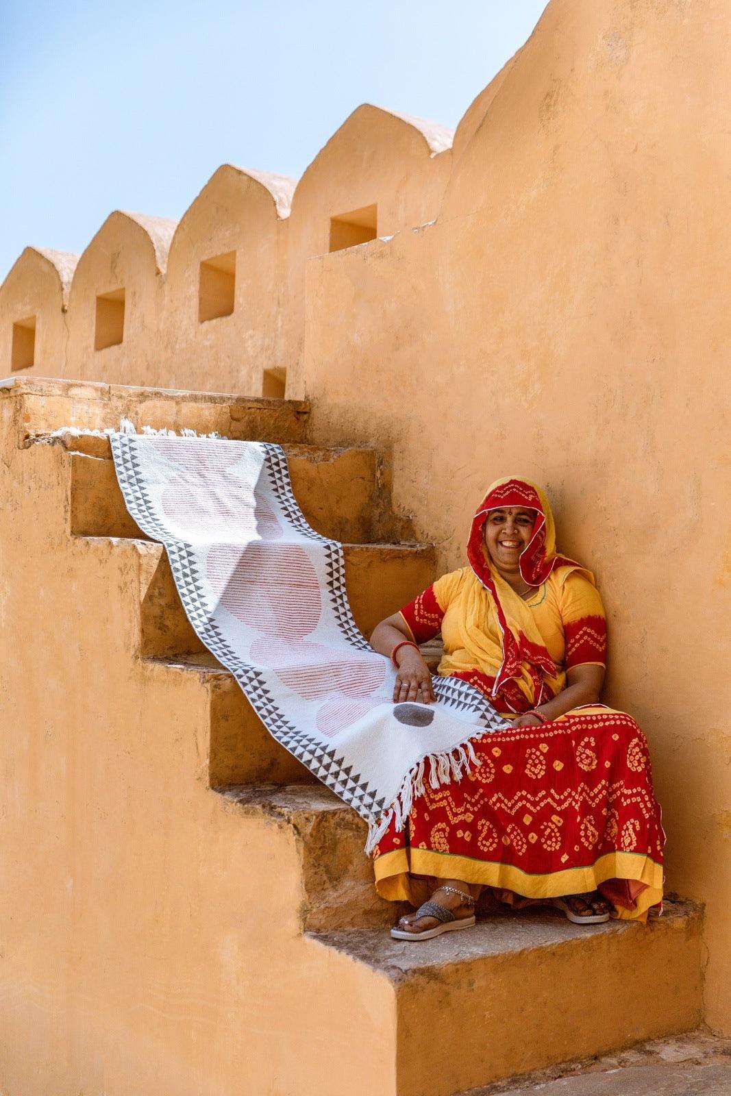 Each rug is handmade, requiring attention from 4 artisans, including wood carvers, block printers, weavers, and dye specialists.