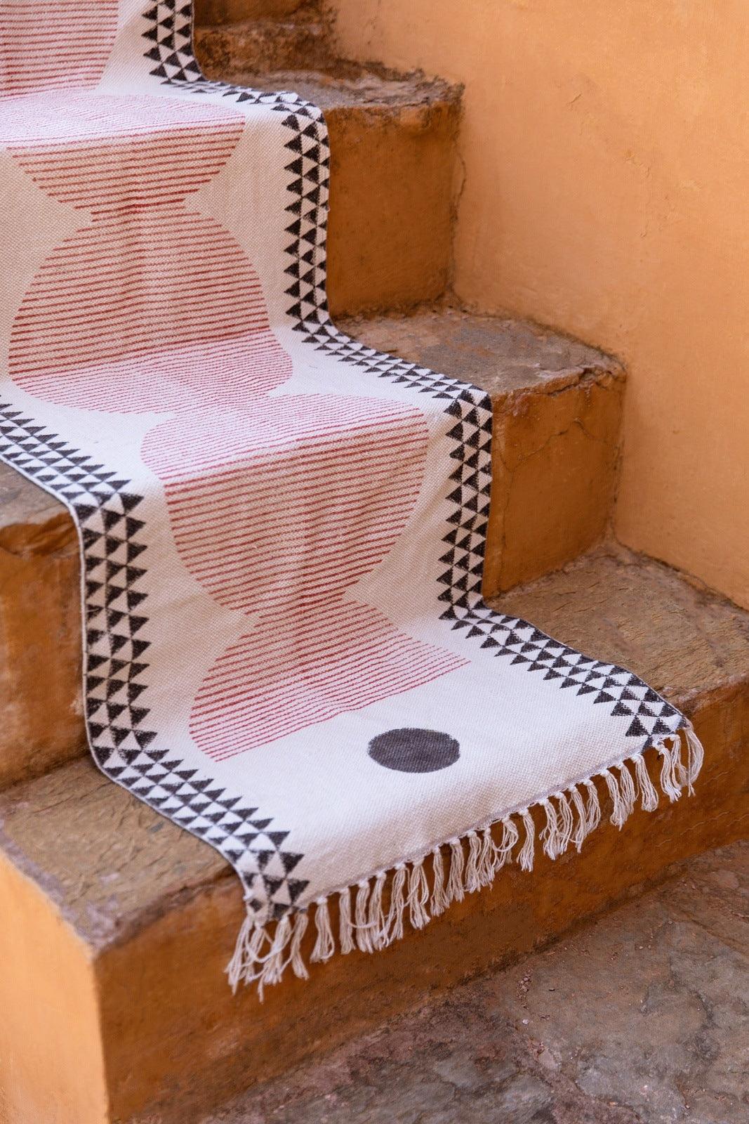The design is hand-pressed onto each rug using hand-carved wooden blocks dipped in dyes. All rugs are made in small batches.