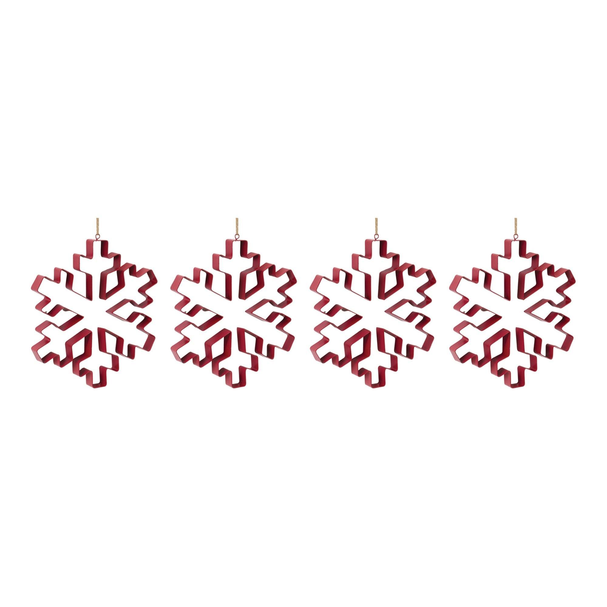 Add a rustic touch to your Christmas Tree with this beautiful set of Snowflake Cookie Cutter Ornaments. Featuring 4 pieces, this set's festive red tone, traditional cookie cutter designs, and snowflake shapes are the perfect combination to create a memorable display. The quality metal composition with jute string hanger is sure to endure for seasons to come. Whether you're adding a touch of cheer to your home or gifting to a loved one, these ornaments will definitely bring smiles to your home.
