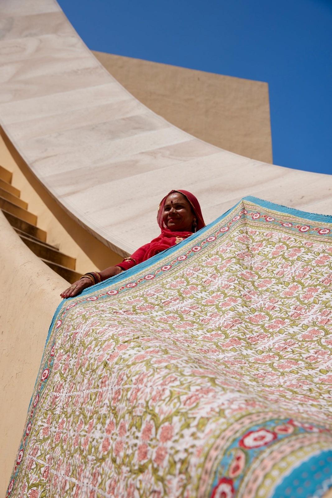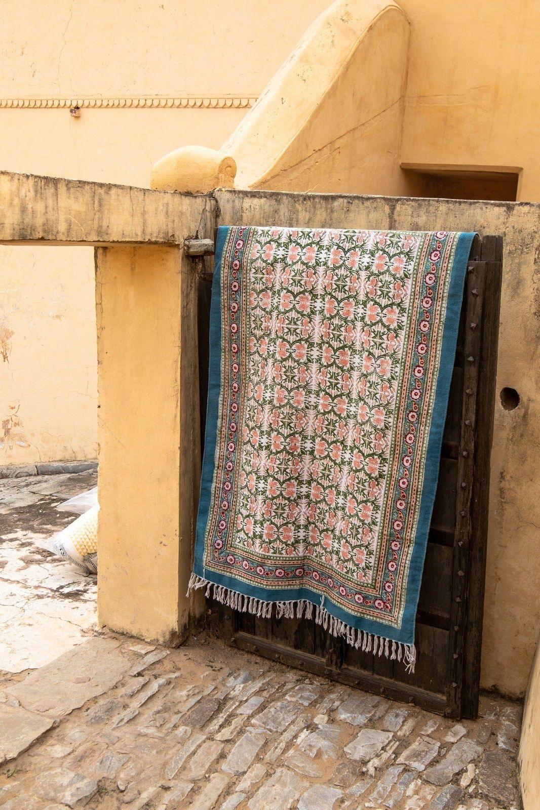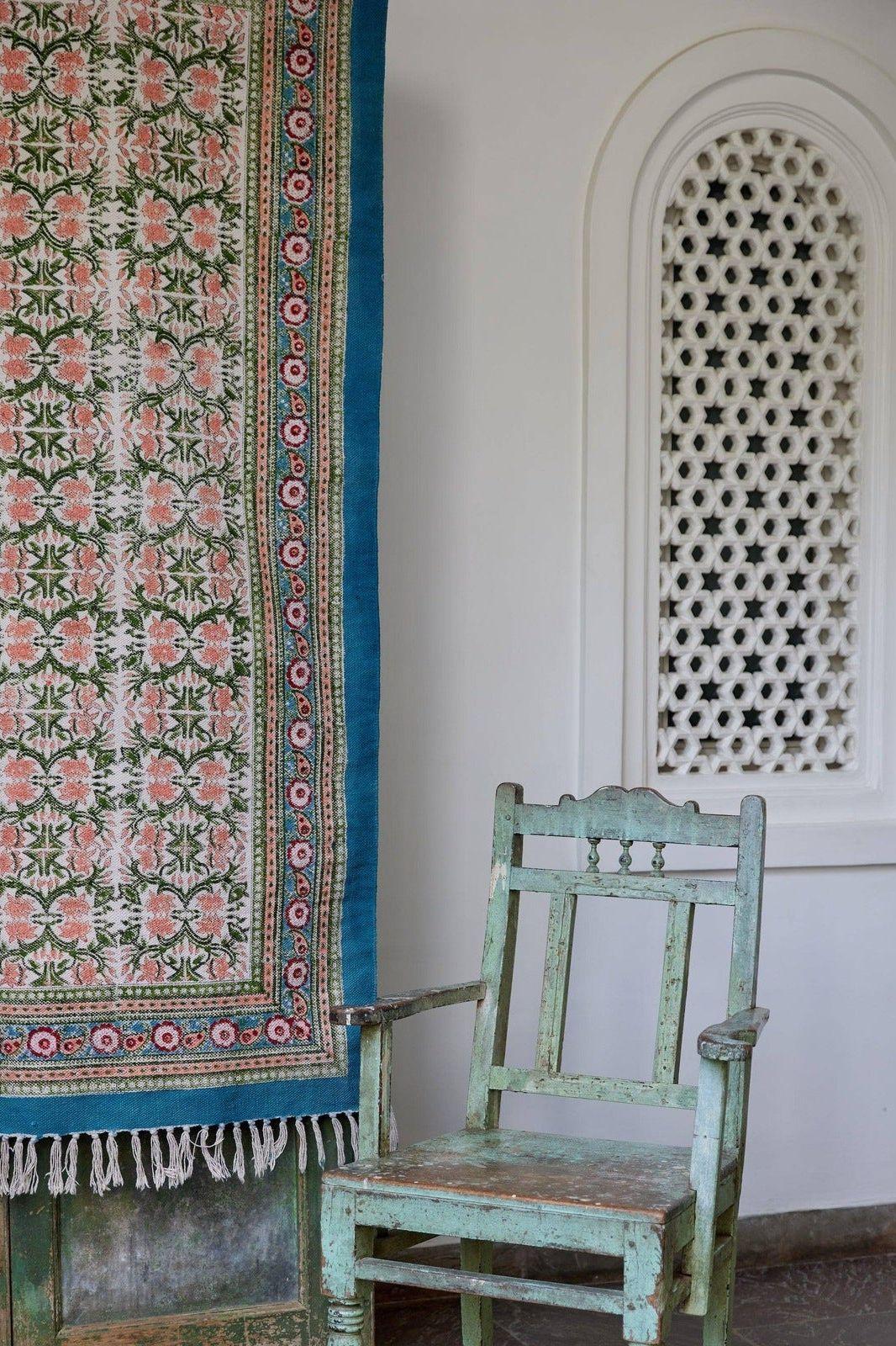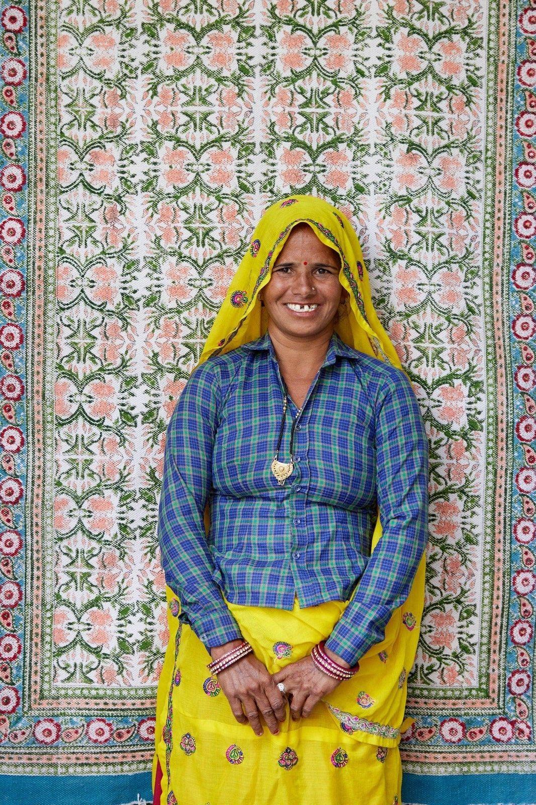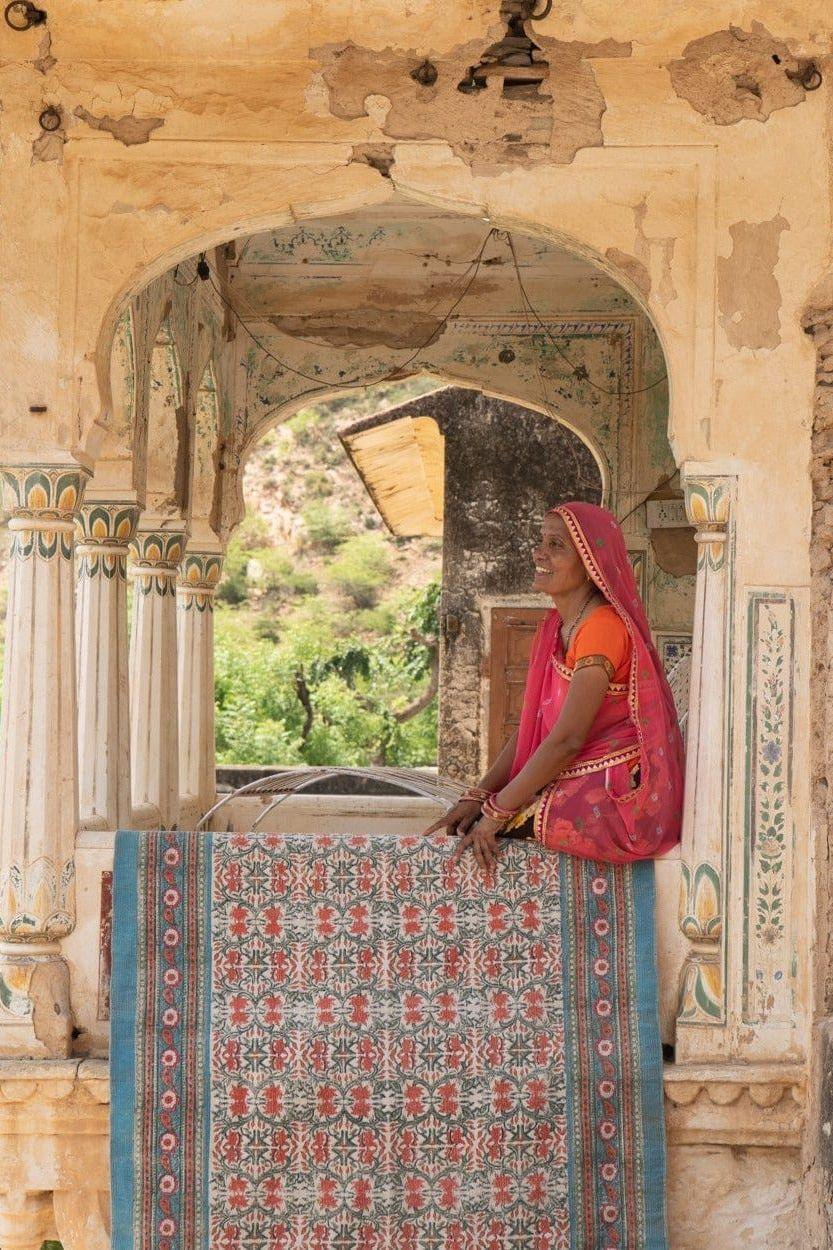 Each rug is handmade, requiring attention from 4 artisans, including wood carvers, block printers, weavers, and dye specialists.