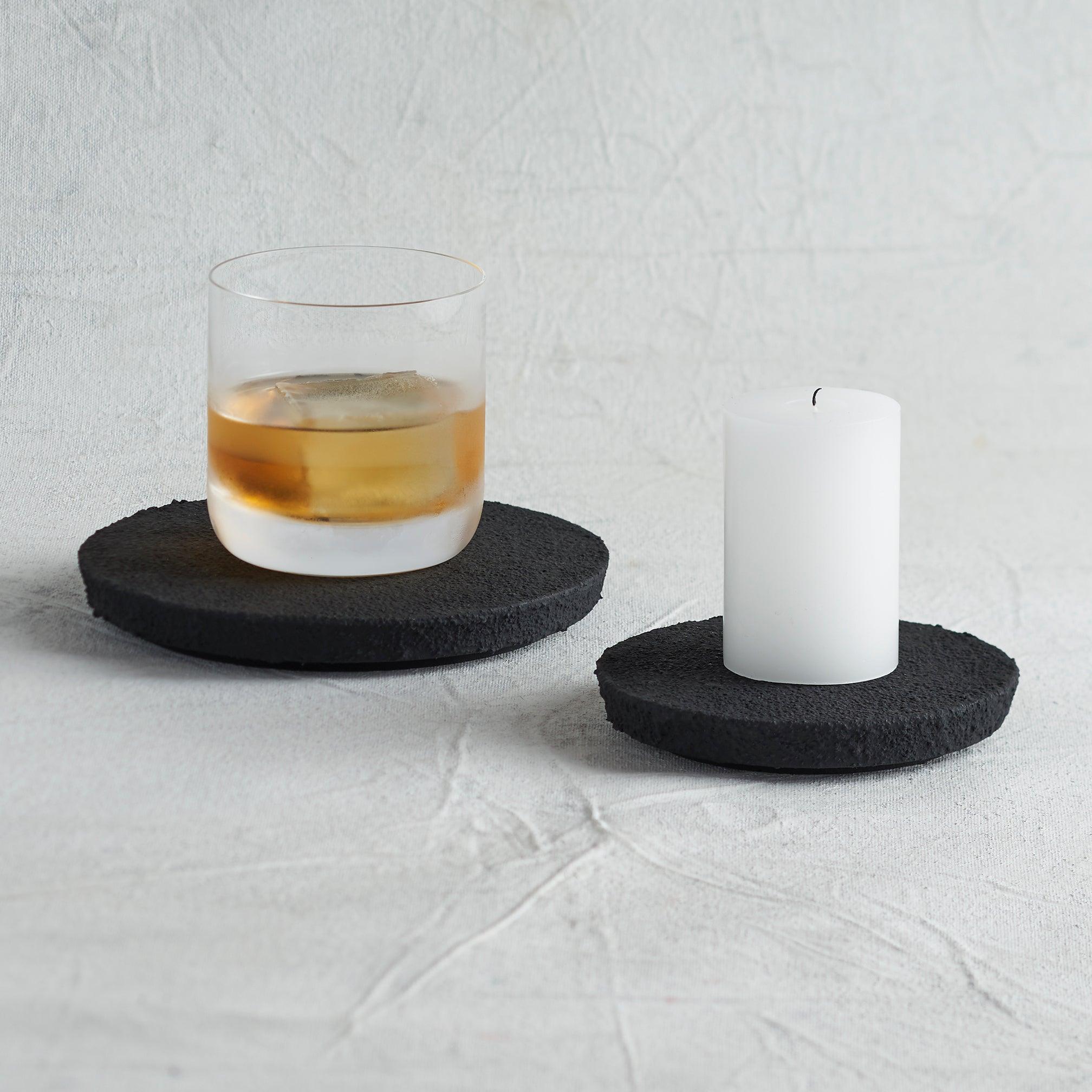 Substantial serving pieces add visual impact to the table and countertop. Thick, sand-cast aluminum forms are finished in a heavy, ash black textured coating, giving them a lava-like appearance. These trivets double as coasters and are backed with felt to prevent surface scratches.