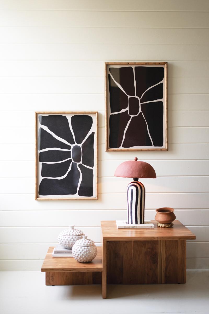Looking for an eye-catching duo? Try this set of black abstract prints under glass. Whether you see large flower petals, streaks of sunlight, or something else entirely, this set is your new conversation piece in simple wooden frames