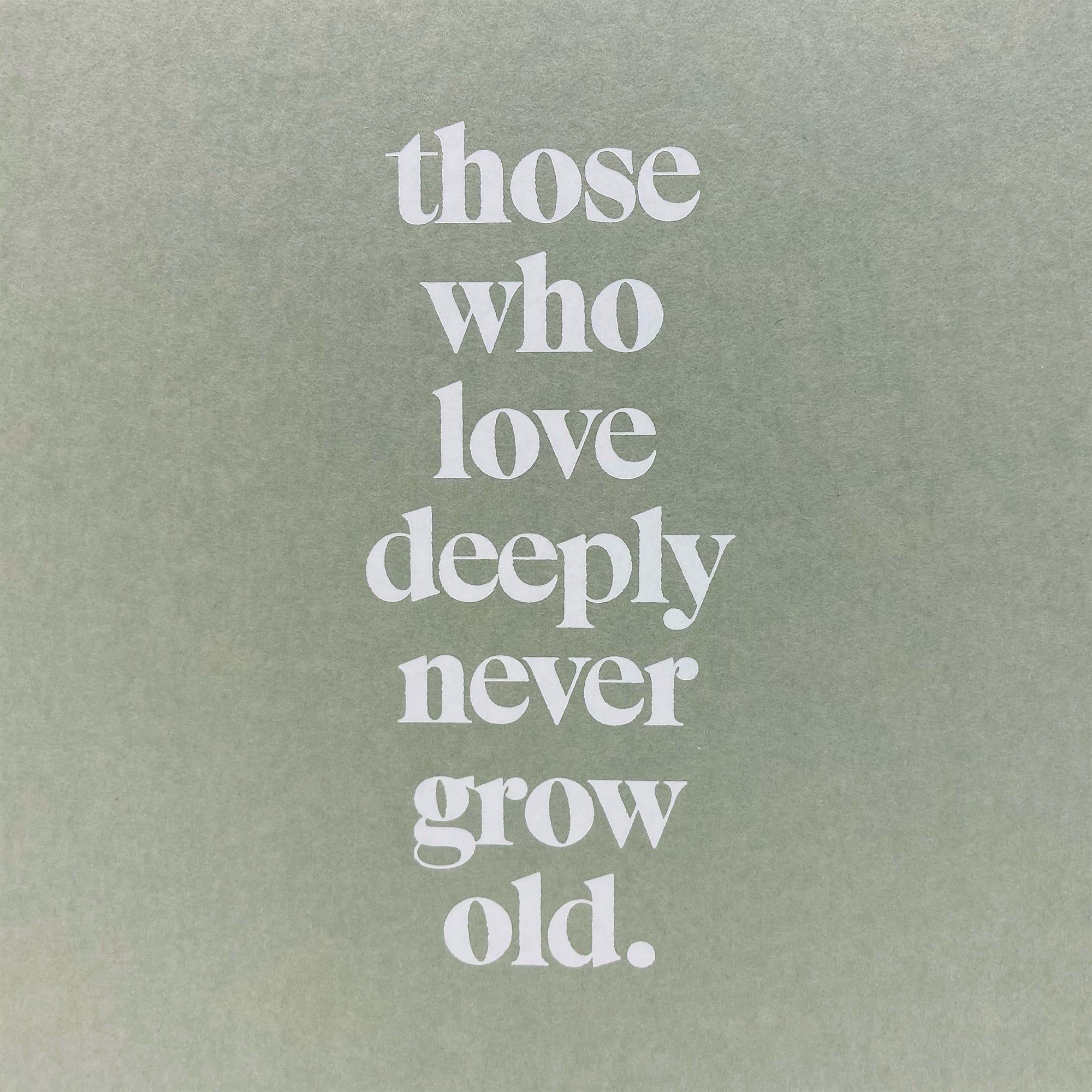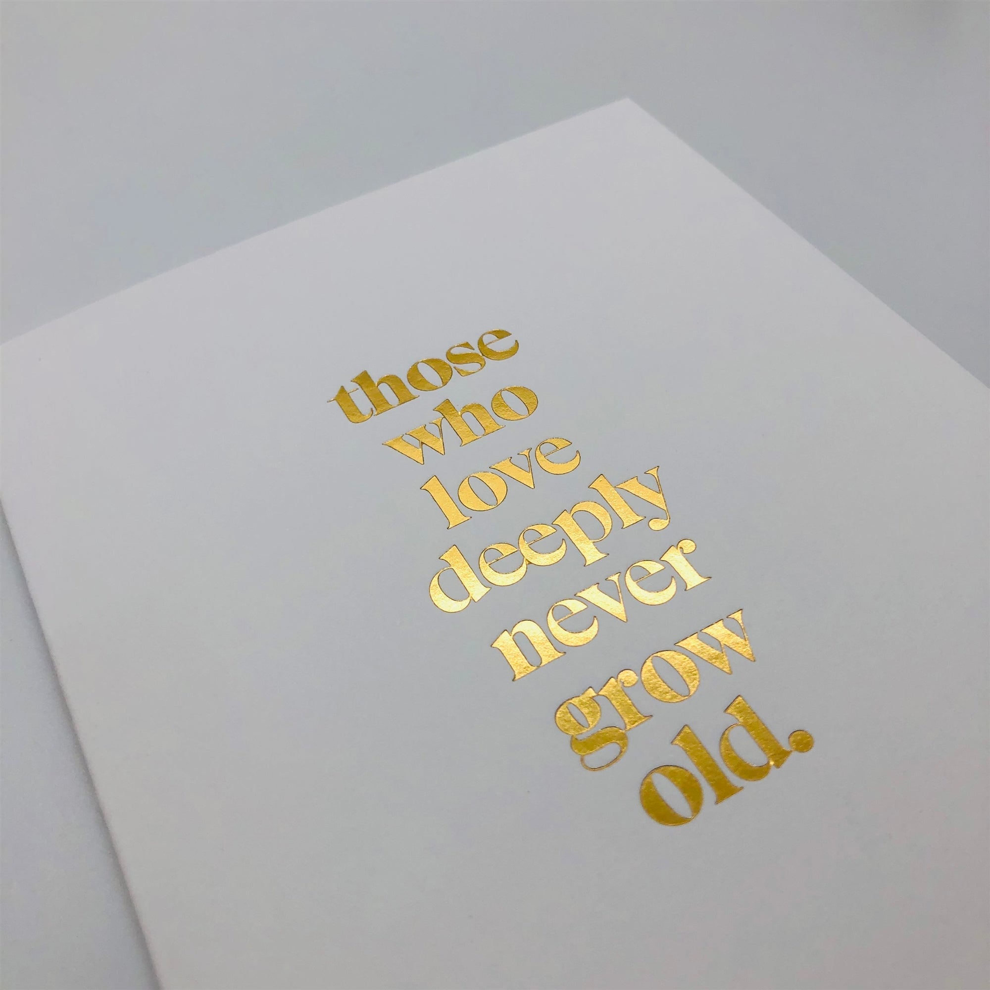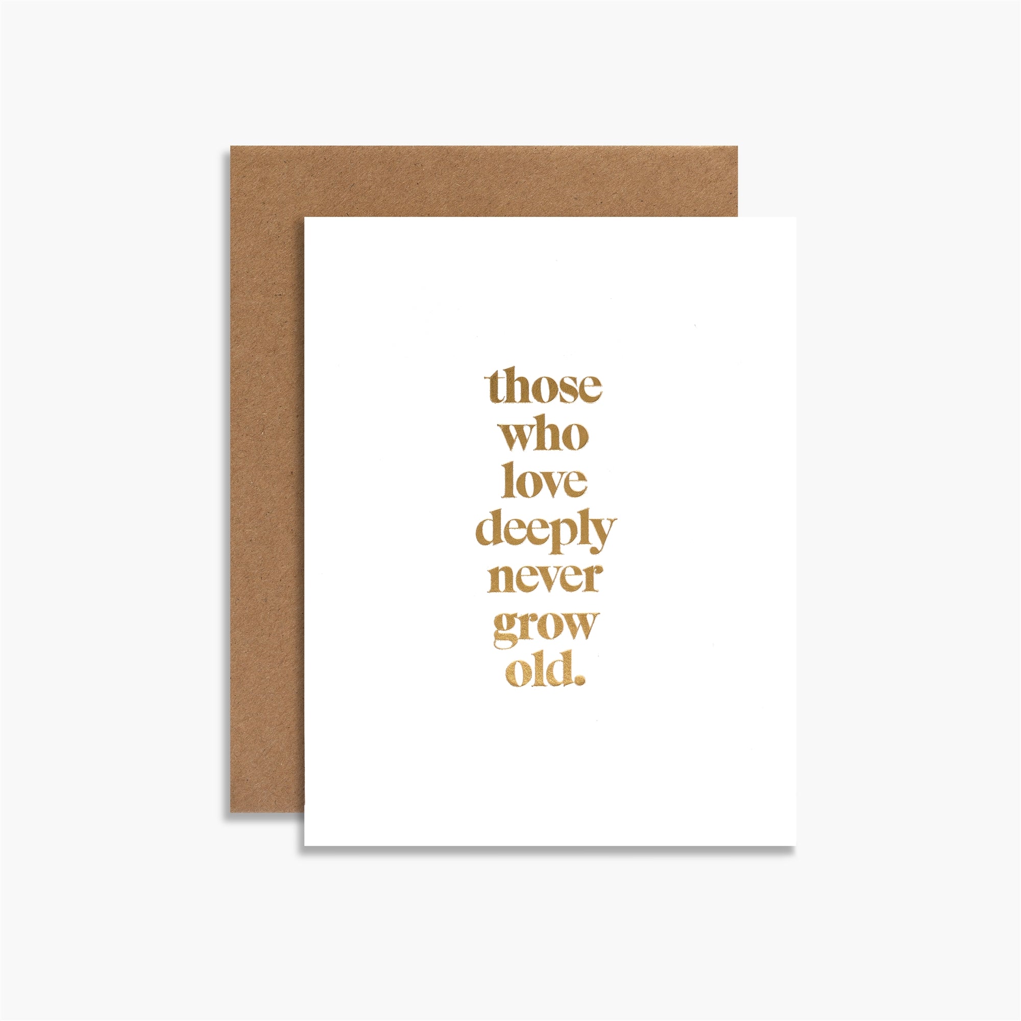 Folded greeting card crafted from cotton cardstock features a timeless sentiment in a bold, stylish typography. Inside Left blank. Envelope and clear cellophane sleeve included.
