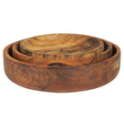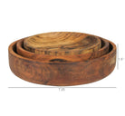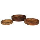 Crafted of acacia wood this set of 3 bowls will be the new entertainment staple. Acacia is known for its exceptional durability. The hue and wood grain will vary. Rinse with soap and water and dry immediately, apply oil as needed. Prior to packing each piece is rubbed with oil for longevity and the oil may transfer to paper, this is non-harmful. Sm: 5x5x0.75. Med: 6x6x1, Lrg: 7.25x7.25x1.5
