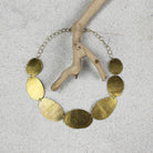 Individual forms of brass with unique textures link together and create a statement necklace. 18” length
