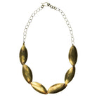 Individual forms of brass with unique textures link together and create a statement necklace. 18” length