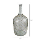 A heavy glass bottles is artfully wrapped in rattan in a lattice pattern creating an amorphous vessel and a statement worthy decorative object.
