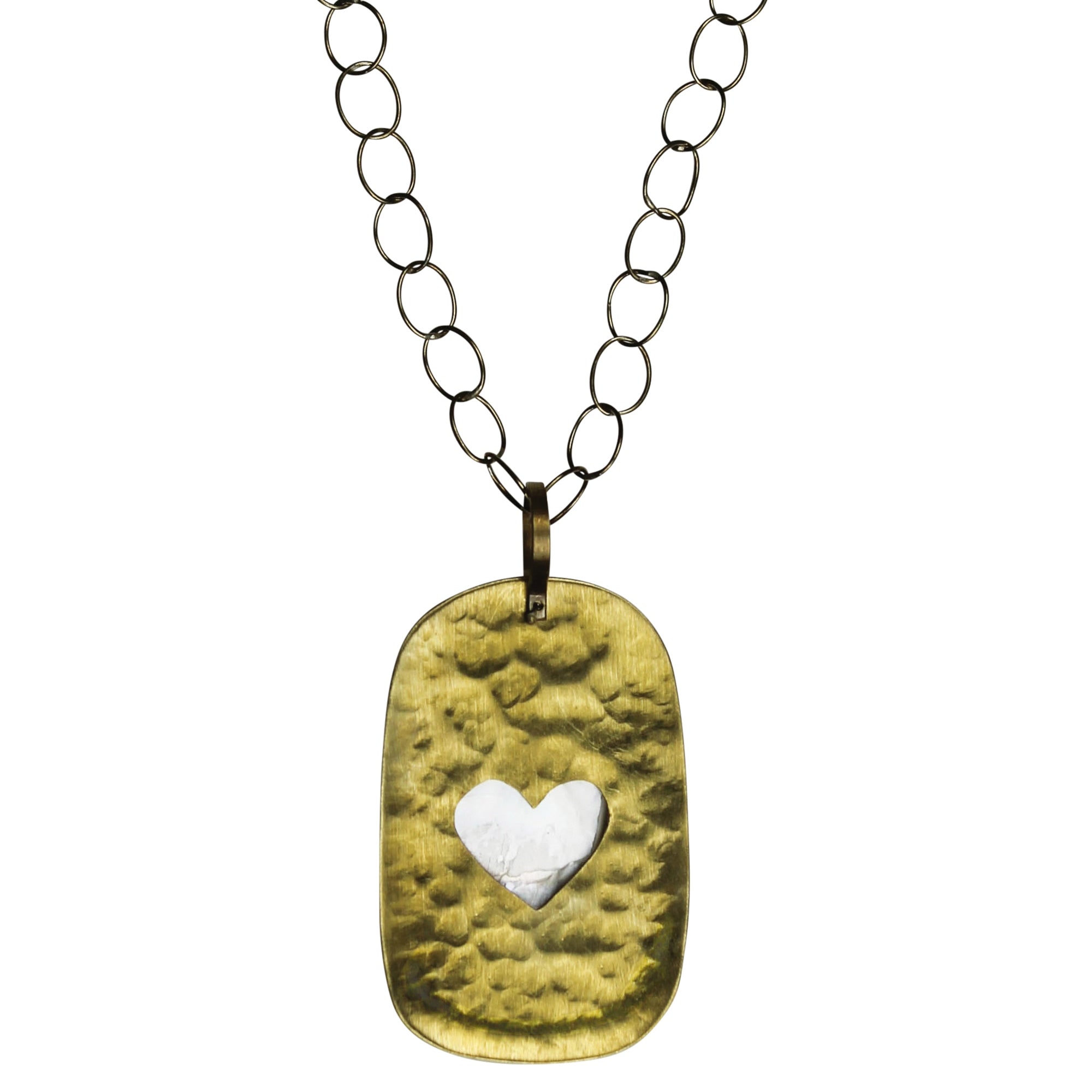 A favorite icon is punched out of hammered brass and accented by Mother of Pearl on the back, adding movement and luster. 1.25" x 2" pendant on 18" chain