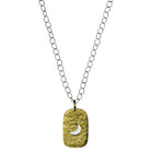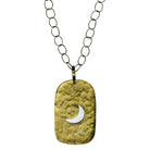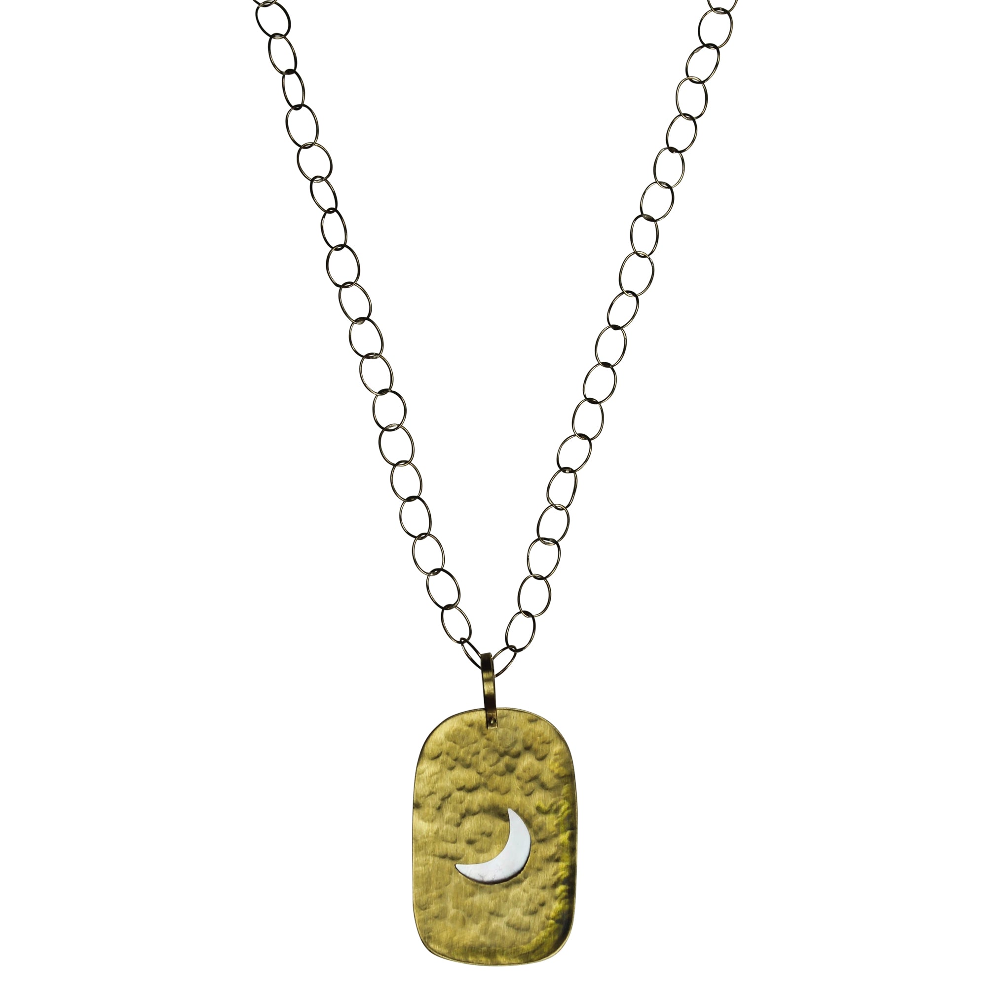 A favorite icon is punched out of hammered brass and accented by Mother of Pearl on the back, adding movement and luster. 1.25" x 2" pendant on 18" chain