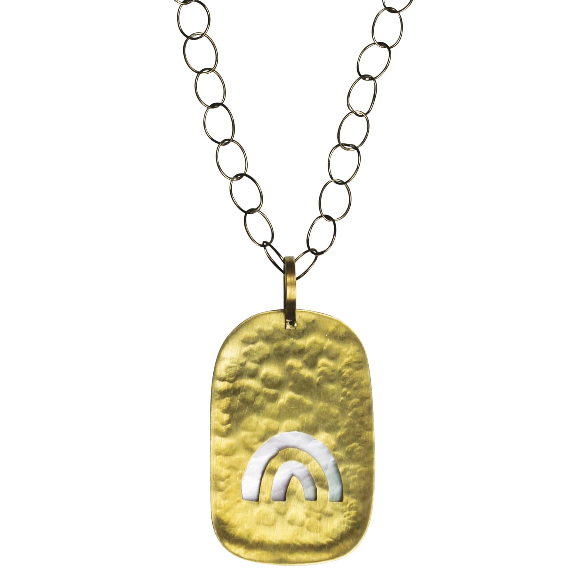 A favorite icon is punched out of hammered brass and accented by Mother of Pearl on the back, adding movement and luster. 1.25" x 2" pendant on 18" chain