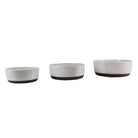 To create our newest tabletop collection we brought together the most beautiful and functional shapes. Each piece is handcrafted from black terra cotta then dipped in our signature white glaze for an aesthetic that dodges notions of prim and proper in favor of everyday, enduring elegance. Microwave and dishwasher safe. Wipe with damp cloth, Wipe with light detergent Set of 3: $20, $25, $30 each. Sizes 8x8x3.5, 9.75x9.75x4, 11.25x11.25x4.75 Inches