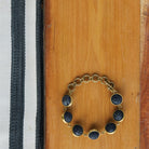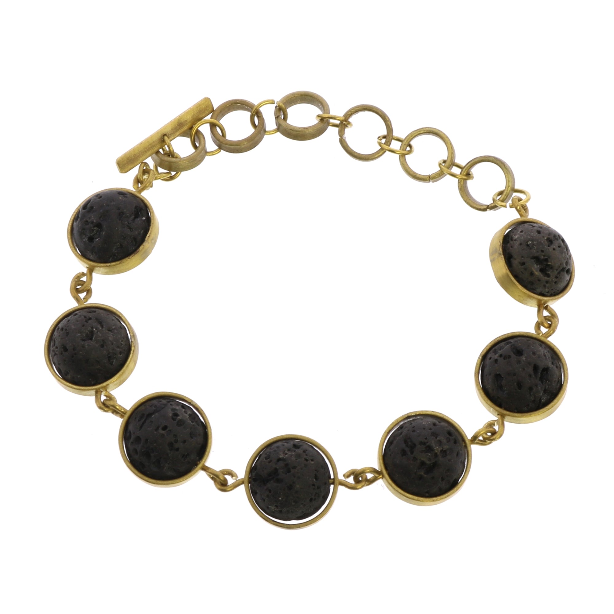 Beads of lava are paired with simple brass forms in this contemporary and unisex collection. 3" diameter
