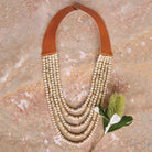Five strands of wood and coconut shell beads are strung onto a leather collar in this stylish and statement making necklace. Snap closure. 17" length