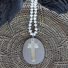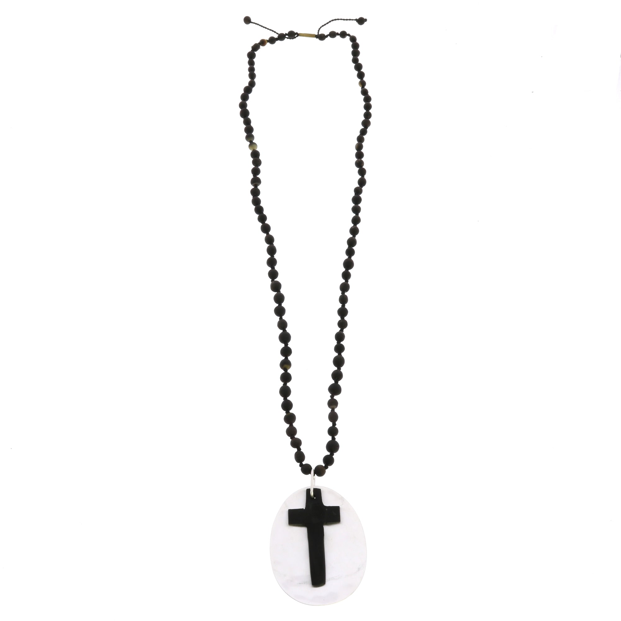 Natures offering of horn and bone are counterbalanced with warm brass or oxidized silver. Pendant hangs on a hand-tied strand.