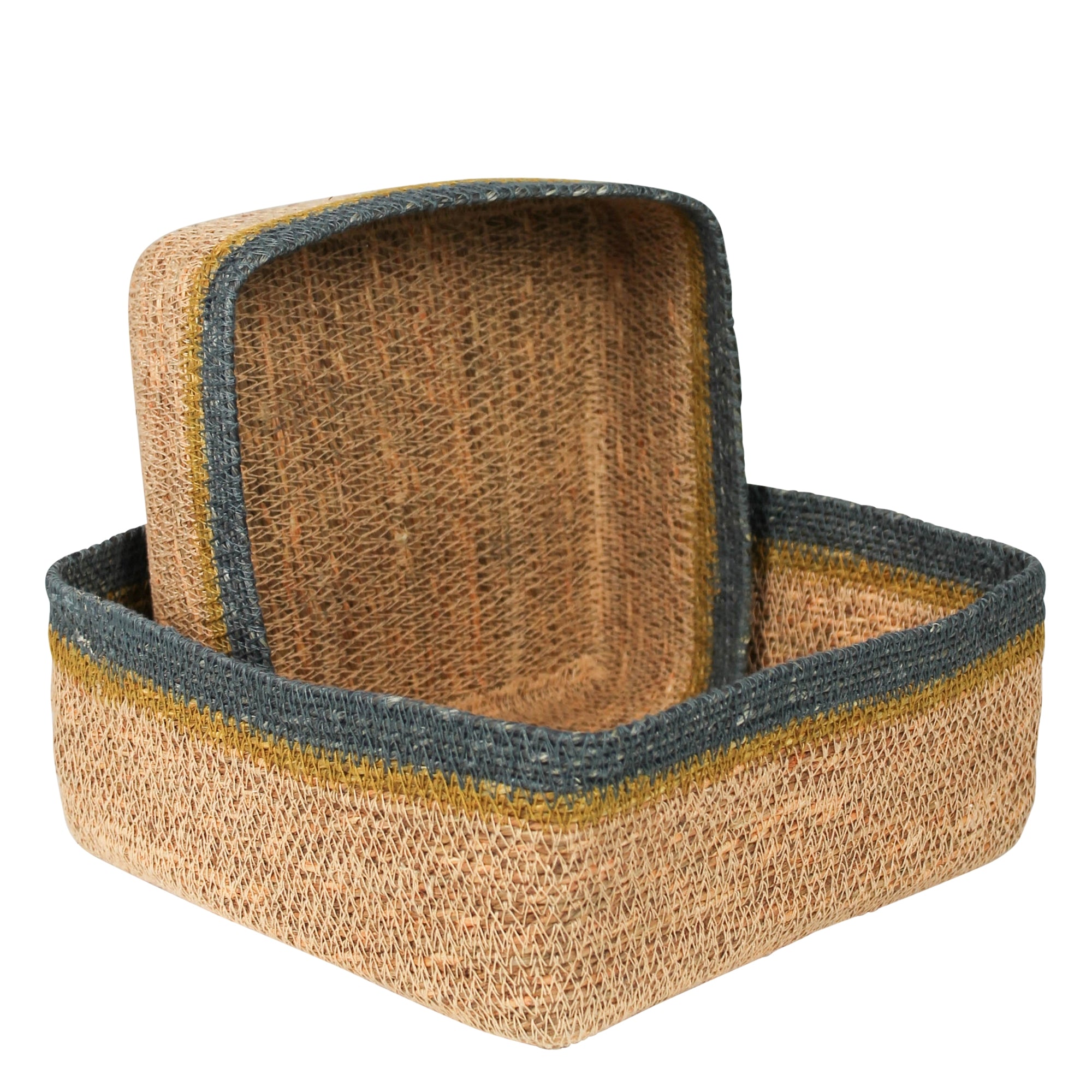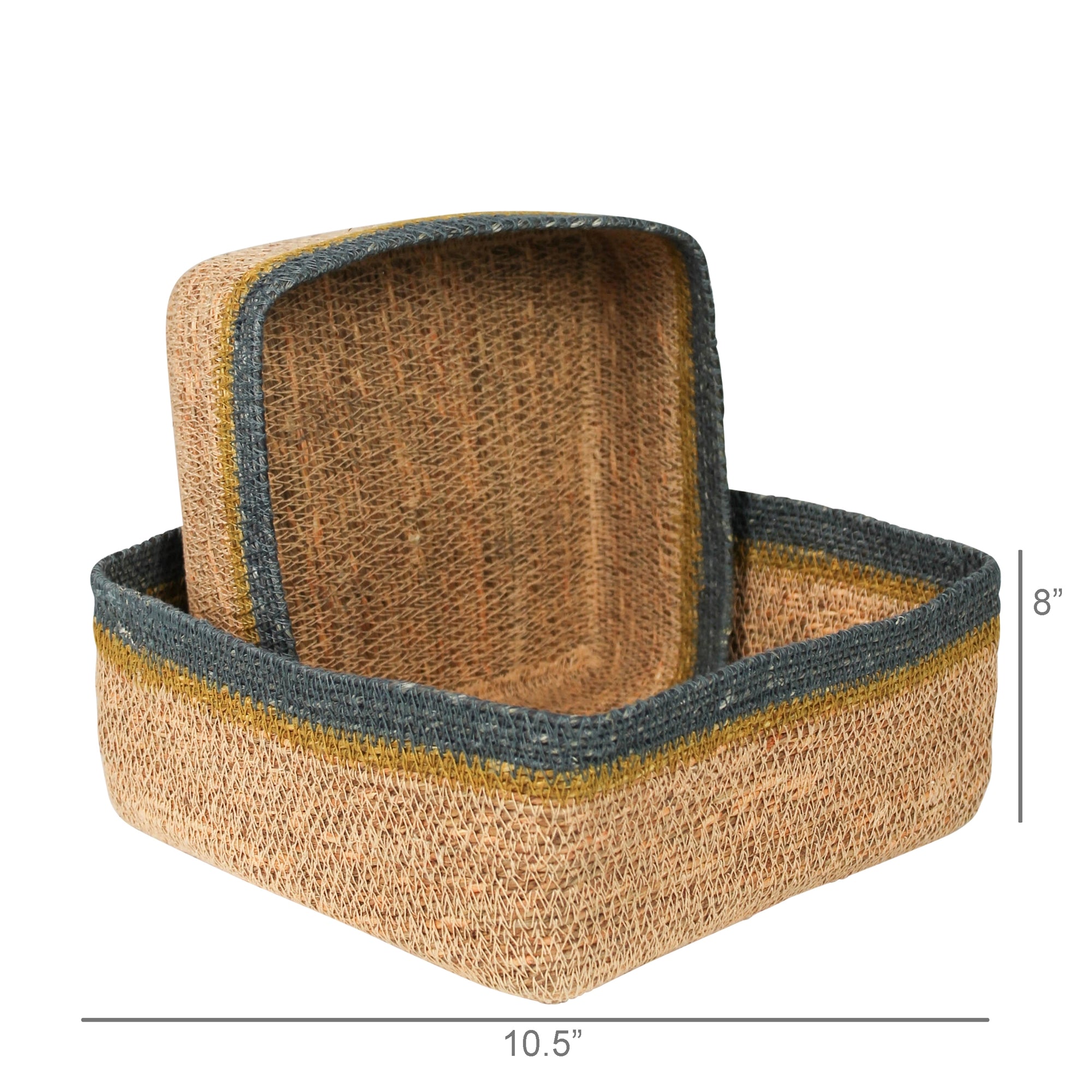 Set of 2 square baskets woven from seagrass with cotton stitching. Their clean, geometric shape and natural texture make them a stylish and practical addition to any space, perfect for organizing or as decorative accents. Eco-friendly and durable. Set of 2: $15, $17, Sm: 8x8x4, Lrg: 10.5x10.5x4.5
