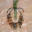 Rings of variegated horn are linked together and interchanged with brass loops. Leather cord extends necklace 6" for a variety of wearable lengths. 10" - 16" length